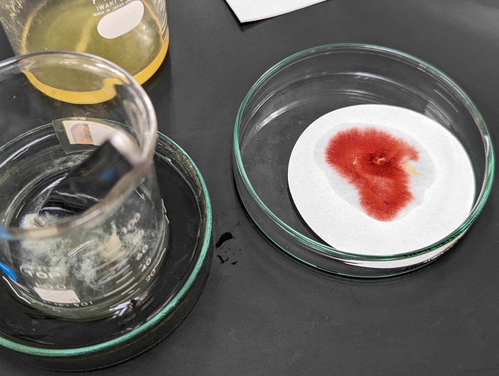 Y2は、ニワトリの肝臓からDNAを抽出する実験です。肝臓に氷と中性洗剤を加え、ミキサーで破砕して、染色体を溶液中に出します。そこに食塩水を入れ、よくかき混ぜた後、ガスバーナーで加熱し、その溶液をガーゼでろ過します。ろ過した液を冷やして、エタノールを流し込むと、ろ液に含まれているDNAがもやもやと境界面上に析出してきます。これをピンセットで取り出し、ろ紙を敷いたシャーレに移し、酢酸オルセイン液を滴落して、紫色に染色されたDNAを観察しました。