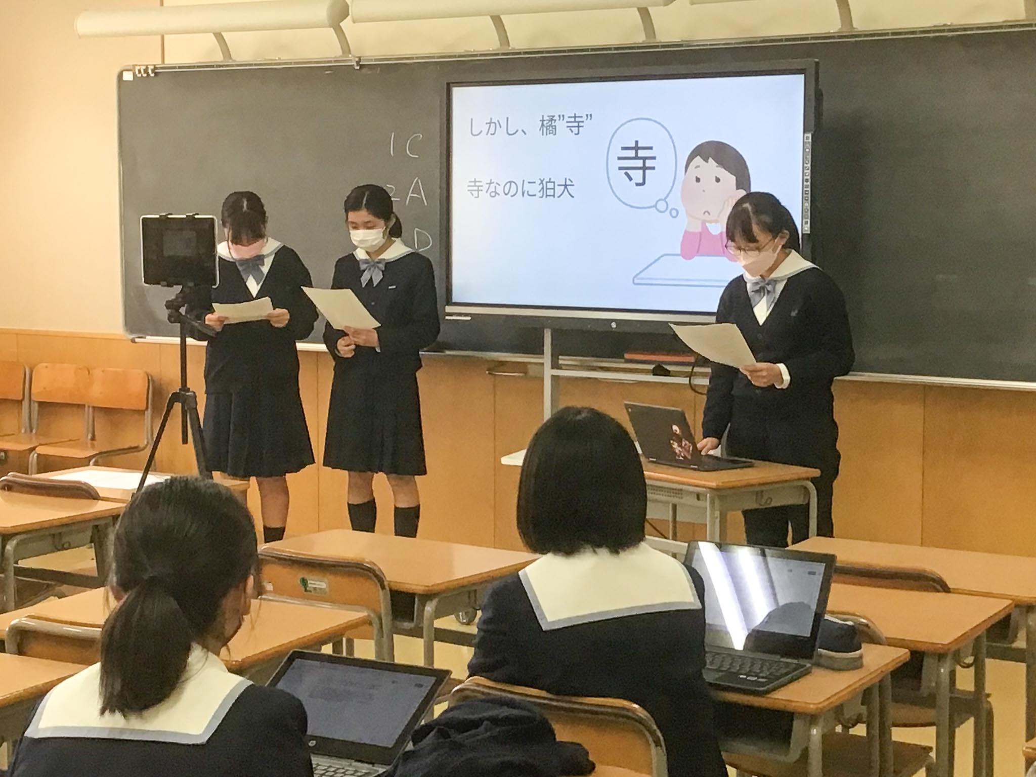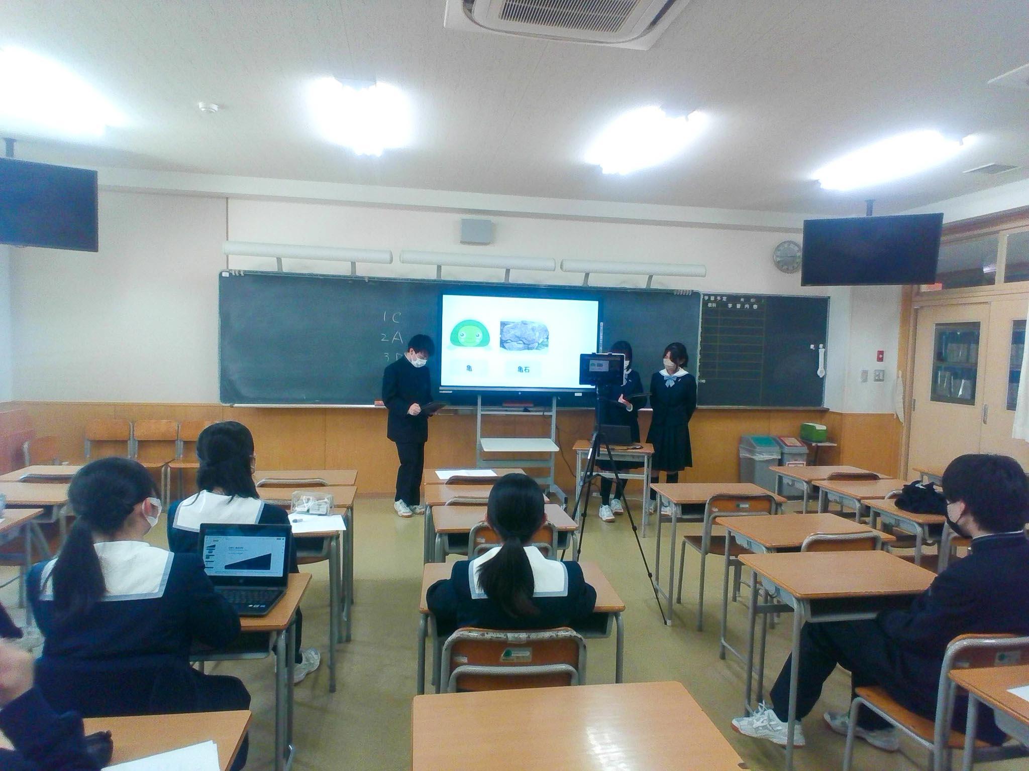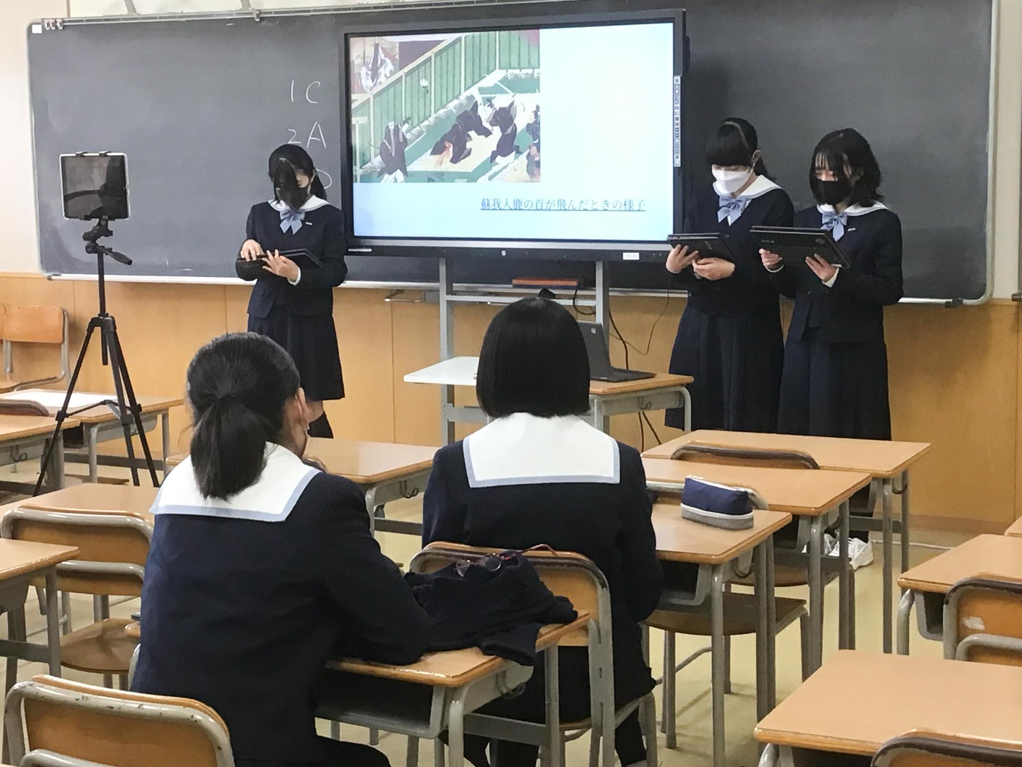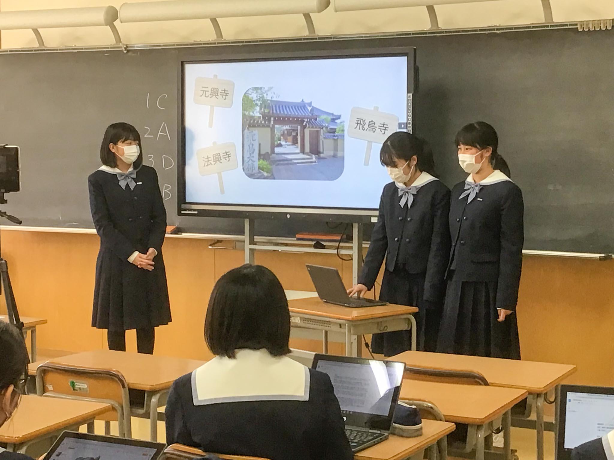 3月14日(月)、M3(中1)学年は、昨年11月に実施した飛鳥社会見学の事後学習のまとめとして学年発表会を行いました。事前に各クラスで発表会を行い、観点別相互採点で特に高評価を得た各クラス代表班の発表でした。本来ならば大講義室に学年一同を会しての発表となるのですが、感染症対策のため、発表者は別室のカメラの前に立ち、情報の時間に作成したスライドを示しながら発表しました。中には原稿を一切見ず、まるでニュースキャスターのように堂々と語ってくれた班もありました。オンラインで各教室にライブ配信された発表を、級友たちは拍手で迎えていました。