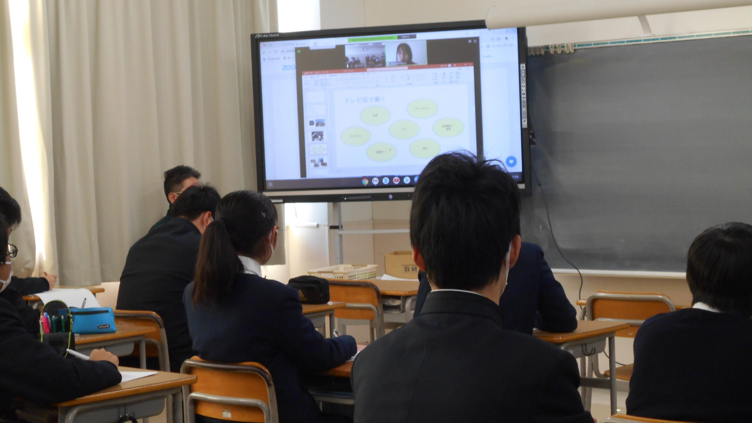 職種は、研修医、記者、建築士、航空会社、広告代理店、電機メーカー、通販営業など様々で、生徒は事前に登録した2種の職業の講座を聴講し、自由に質問をしました。