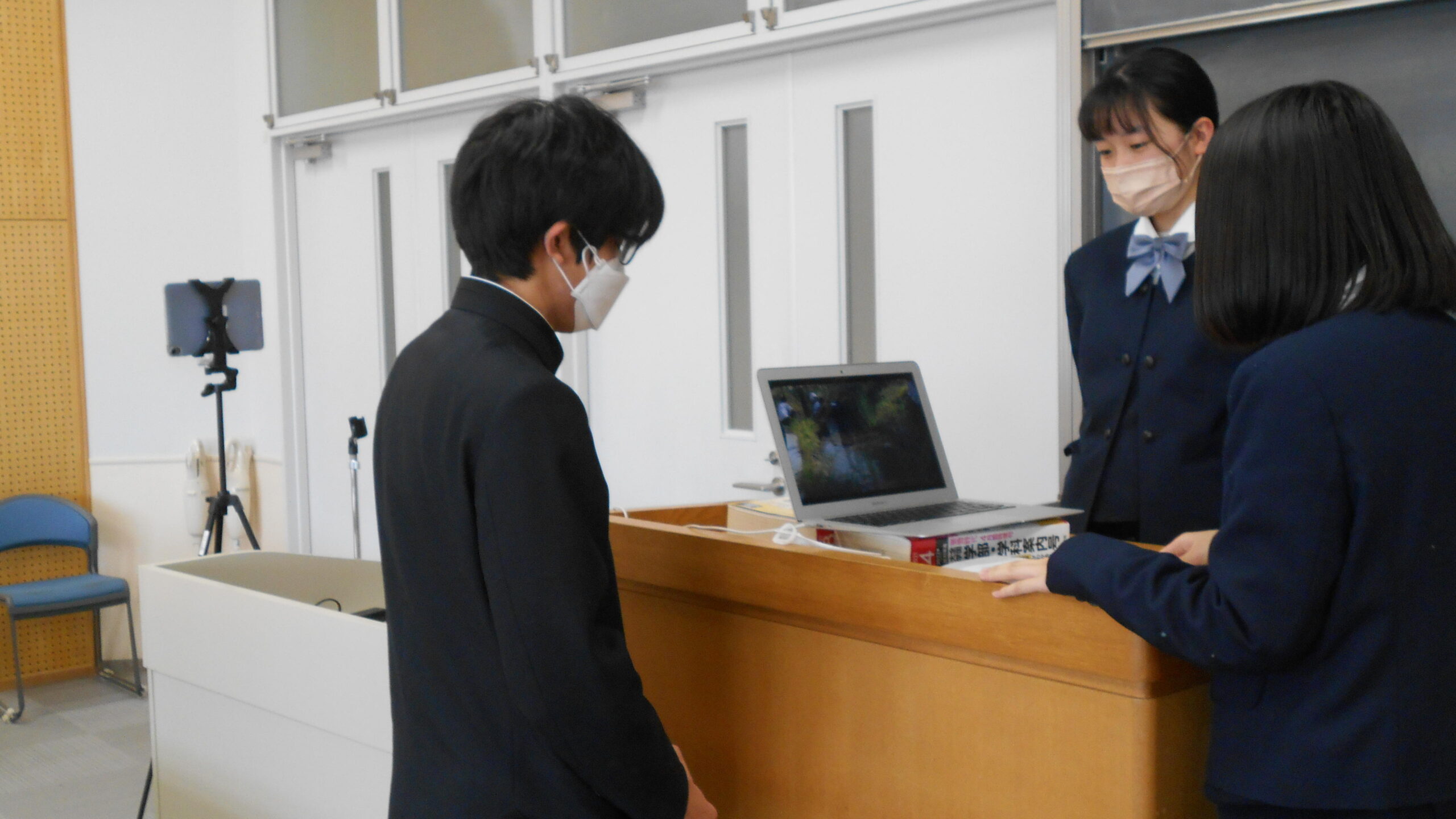 県立高校で実施されている「総合的な探究の時間・奈良タイム」学習研究発表会及び「WWL(World Wide Learning)コンソーシアム構築支援事業」課題研究発表会に本校の自然再生研究会のメンバーが参加し、「地域の生き物が安定して生息できる環境づくり活動の内容と今後の展望について」というテーマで研究成果を発表しました。発表は、オンラインで行われ、校内のビオトープの整備、地域へのフィールドワーク等、これまでの活動内容と今後の取組について、SDGsの目標と関連づけながら、流暢な”All English”で説明しました。