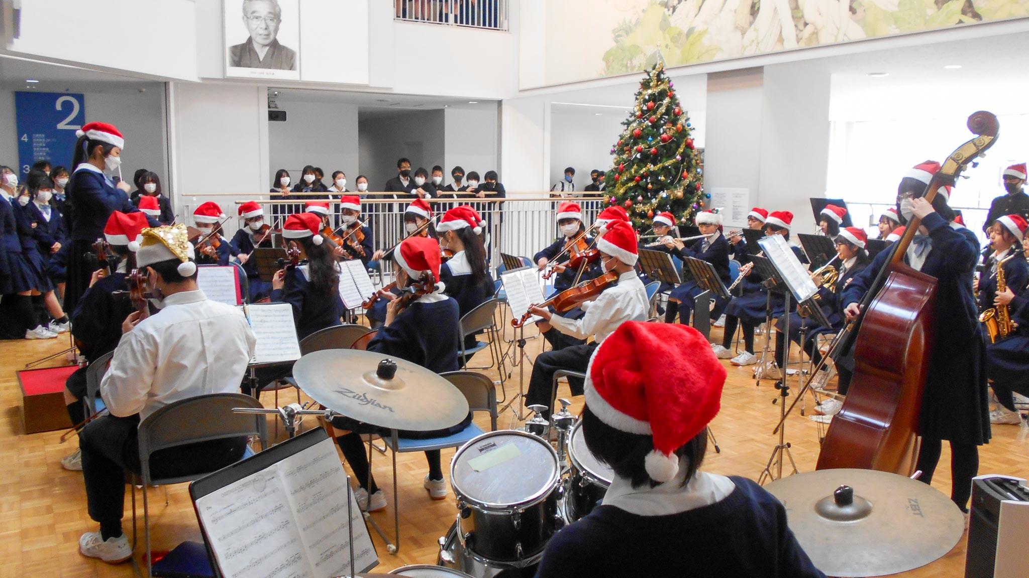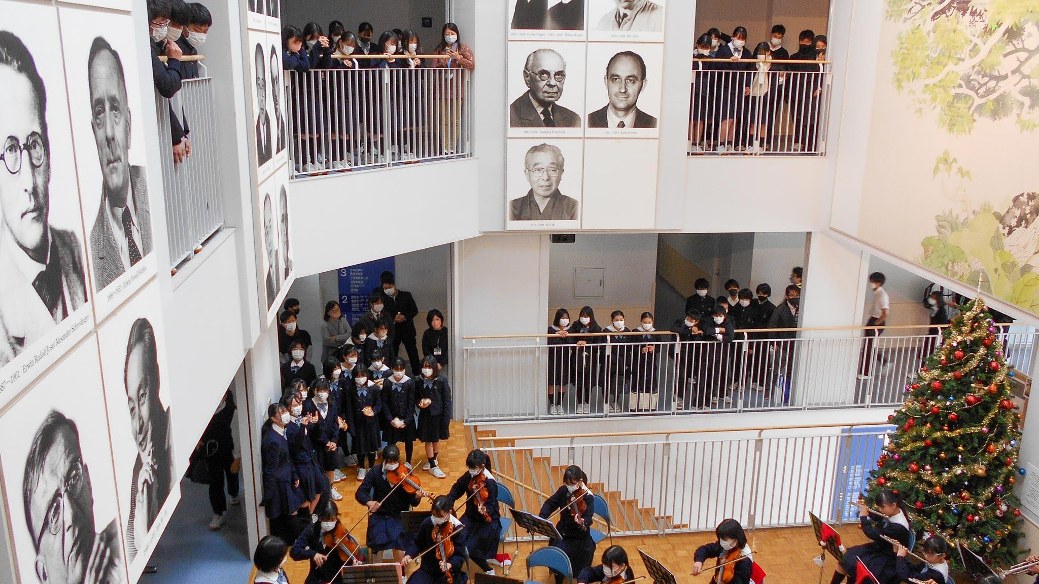 24日終業式の放課後、室内楽部によるクリスマスコンサートを開催しました。今年の楽曲は、「ディズニーセレブレーション」、「魔女の宅急便」、「クリスマスソングメドレー」で、いずれも生徒の指揮で演奏されました。生徒会役員が飾ってくれたクリスマスツリーと書道部の作品を背景に、今年も心和む、美しい旋律をサイエンスホール全体に響かせてくれ、たくさんの観客から大きな拍手がわき上がりました。