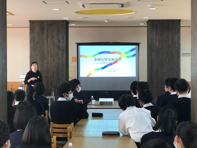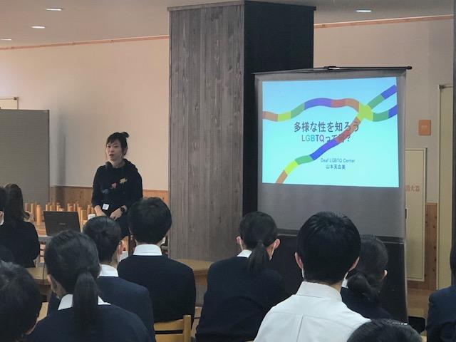 10月30日(土)の4時間目、Y4(高1)学年生徒対象の人権講演会を実施しました。これは中高の人権学習のまとめにかえてこの時期に毎年実施しているもので、今年で4回目です。Deaf-LGBTQ Center・山本芙由美さんを講師に迎え「多様な性を知り、自分の性を知ろう」と題し、ご講演をいただきました。