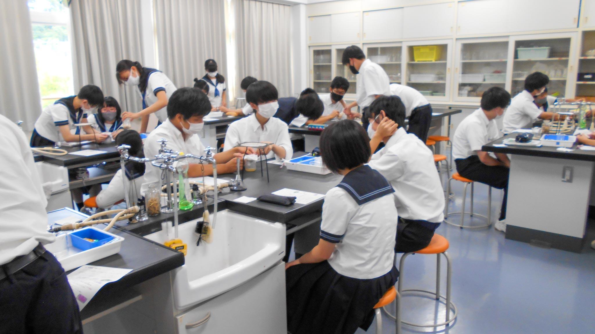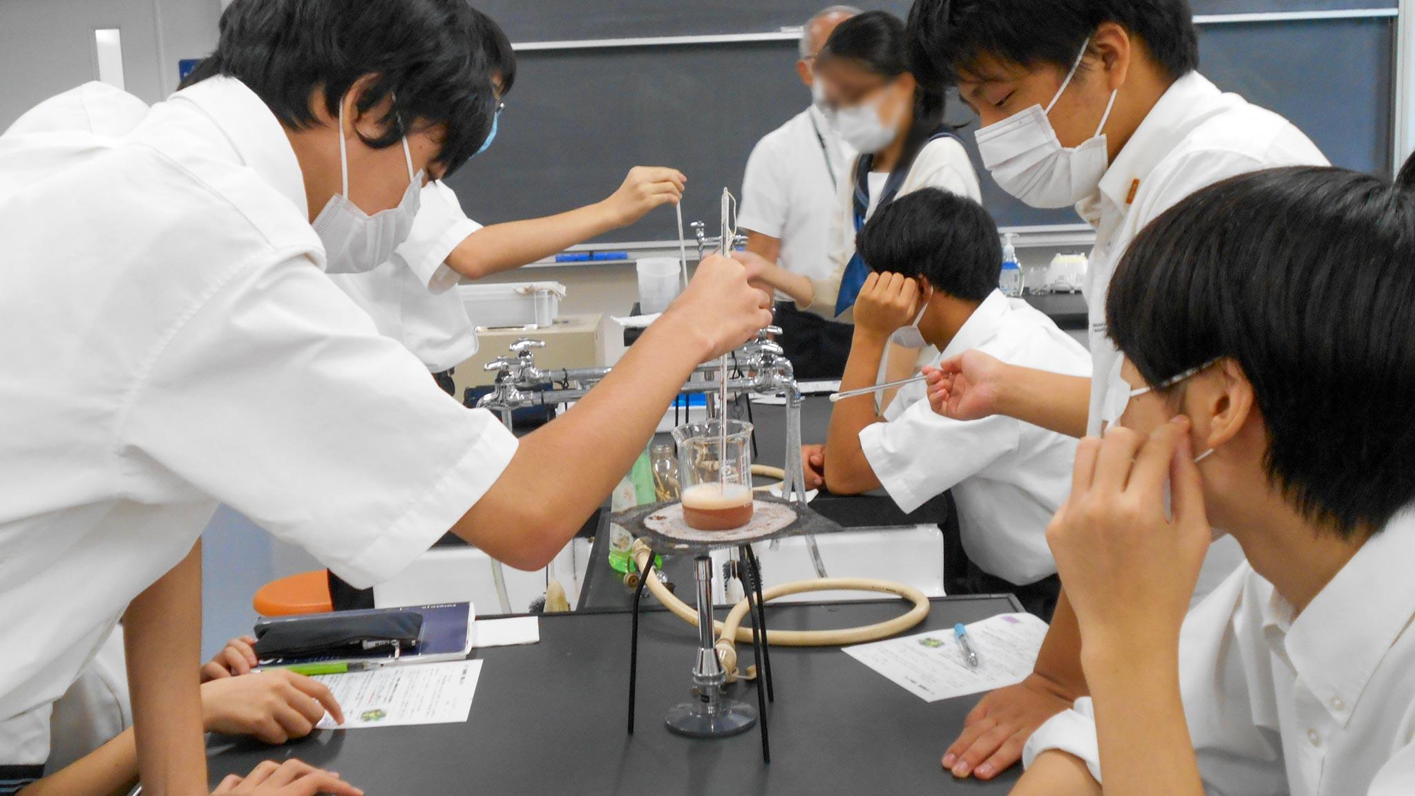 まるで料理番組のレシピのように表記された実験レシピには、実験のそれぞれの段階での留意事項や解説などが細かく記載されており、生徒たちは手際よく協力して実験を進めていました。