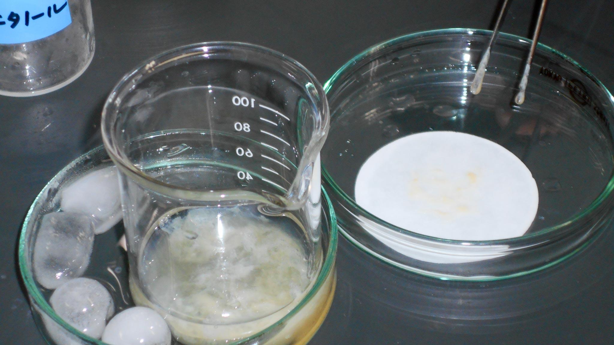ニワトリの肝臓に氷と中性洗剤を混ぜてミキサーで破砕した液に食塩水を入れ、よく混ぜた溶液を5分間、ガラス棒でかき混ぜながらガスバーナーで80℃くらいまで加熱します。その溶液を200mlビーカーに、4枚重ねたガーゼでろ過し、下に落ちる液に含まれるDNAを抽出する実験です。