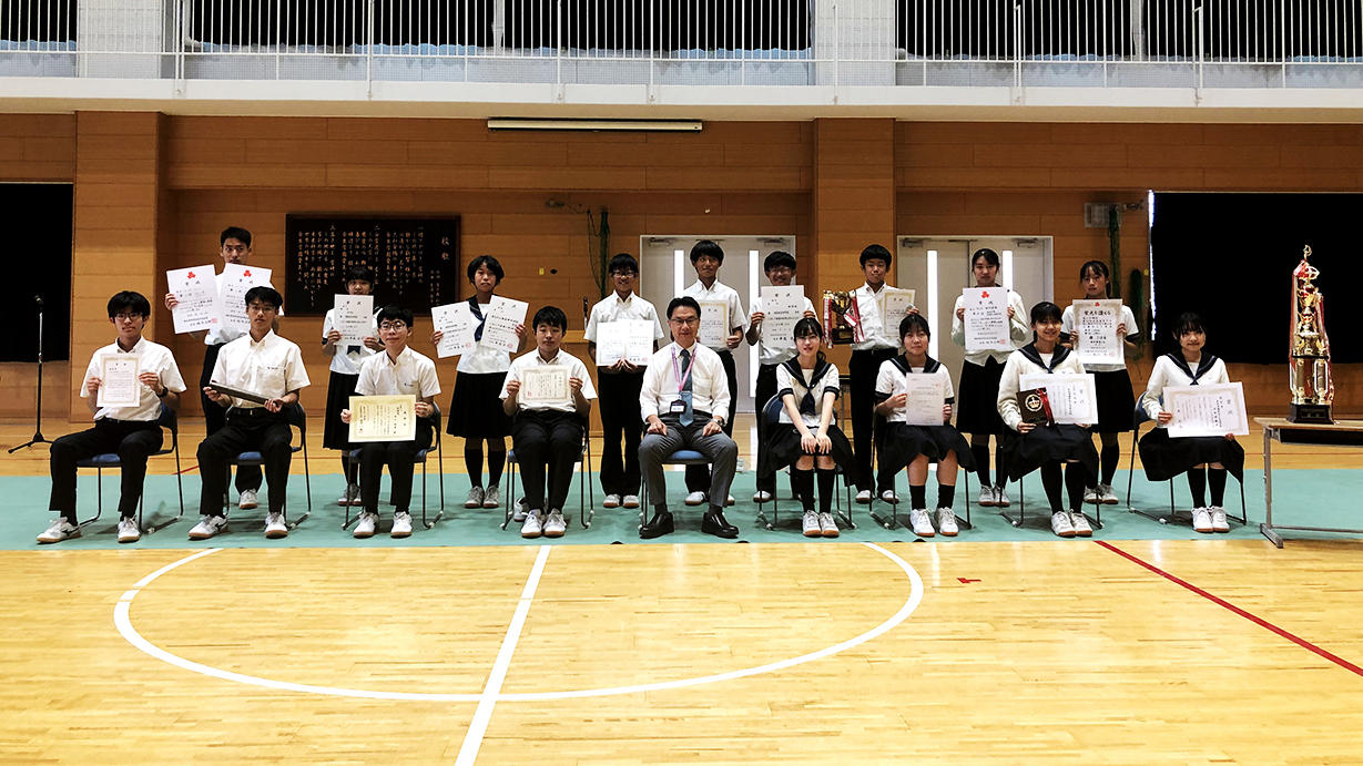 終業式後は、P体育館で運動部・文化部などが受けた賞状伝達を行いました。陸上競技部・テニス部・辯論部・競技かるた部・囲碁将棋部(大会中で欠席)・放送委員会・自然再生研究会・数学愛好会・水泳競技の頼もしい部員・選手たちに賞状を手渡し、激励させていただきました。