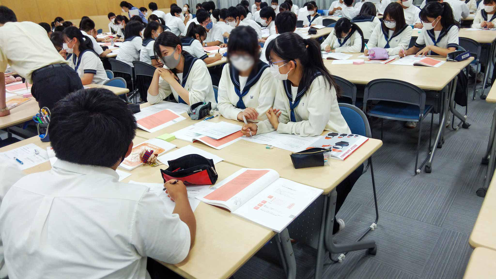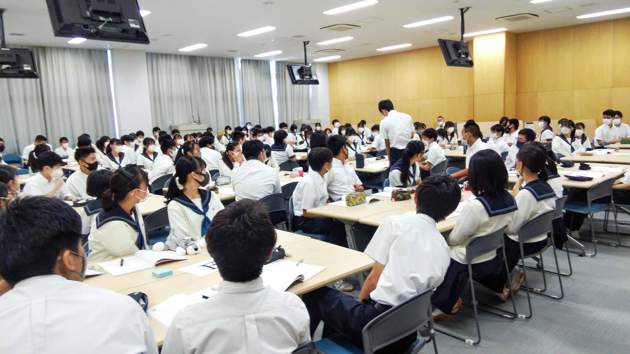Y1(中3)学年では、昨年度に引き続き探究学習の新しい取組として、「企業探究コーポレートアクセス」が始まりました。1週間の集中授業で進みますが、今日はそのスタートで3・4限に全員が大講義室に集まり、クラスの枠を越えたグループに分かれてワークショップを行いました。