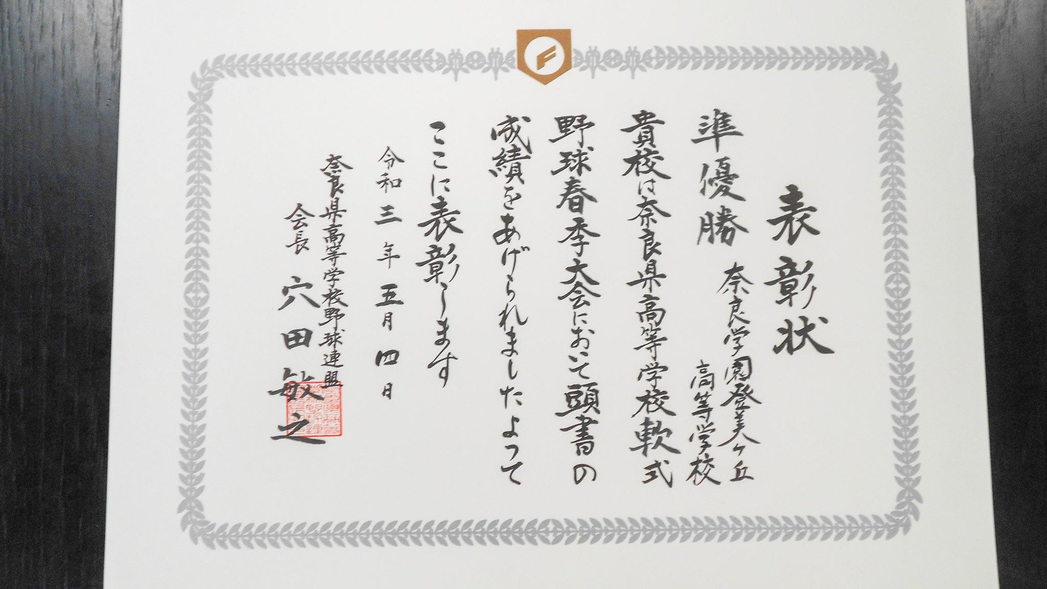 決勝は、昨夏・秋の優勝校である天理との対戦。春季大会でも昨年度まで5期連続で優勝している強豪の壁は厚く、0-6で敗れ、準優勝となりました。選手たちは、「天理と闘って点差ほどの力の差はないと感じた。夏は勝てる見込みもあります!」と力強く語ってくれました。