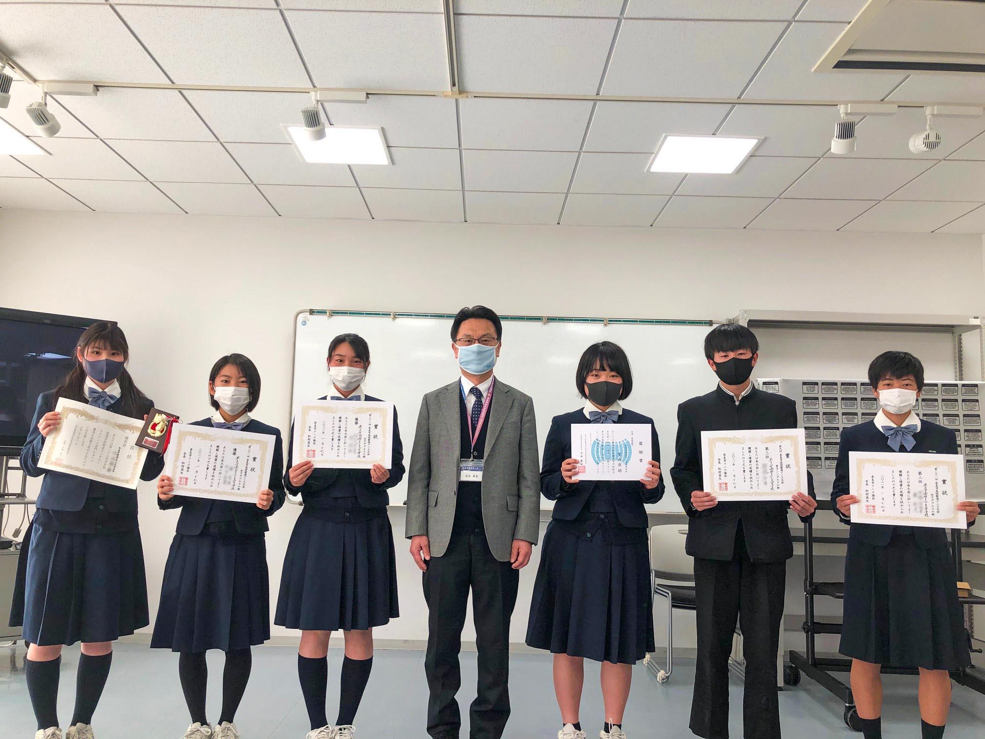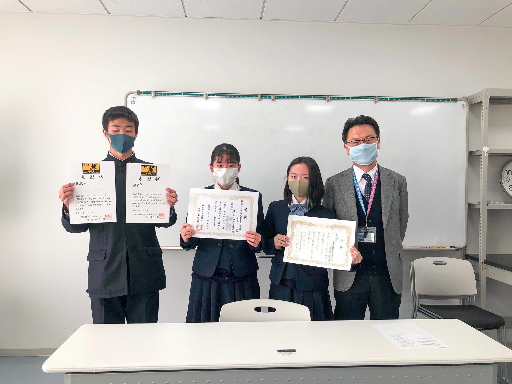 さらに、サッカー部(高円宮杯U-18サッカーリーグNFA3部リーグCブロック 最優秀選手・得点王)・テニス部(奈良市高校新進テニス大会女子ダブルス優勝・第3位、同女子シングルス優勝・男子シングルス第3位)・室内楽部(近畿高等学校総合文化祭奈良大会 器楽・合唱部門奨励賞)・放送委員会(奈良県高等学校放送コンテスト アナウンス部門優秀賞・朗読部門奨励賞・ショートムービー部門奨励賞)、陸上競技部(日本室内陸上競技大阪大会U-18女子60m第2位)の各部等で成果をあげた生徒たちへ各賞を、いずれも密を避けるために各学年別に時間を区切り、賞状と副賞を伝達のうえ、記念撮影を行いその栄誉を讃えました。