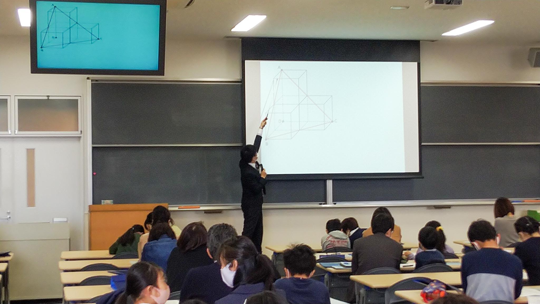 その後、数学教員から「中学入試この一問」と題し、今年度入試に出題した算数の一番難しかった問題の解説をしました。図形をスクリーンに映しながら、答えを導くプロセスや考え方のポイントなどを分りやすく説明し、「解法を覚えていなくてもルールを理解していれば自分で考えて解ける。」と激励しました。参加いただいた保護者の皆様も真剣に難問に挑戦しておられ、質問が出るなど熱気のある解説会となりました。