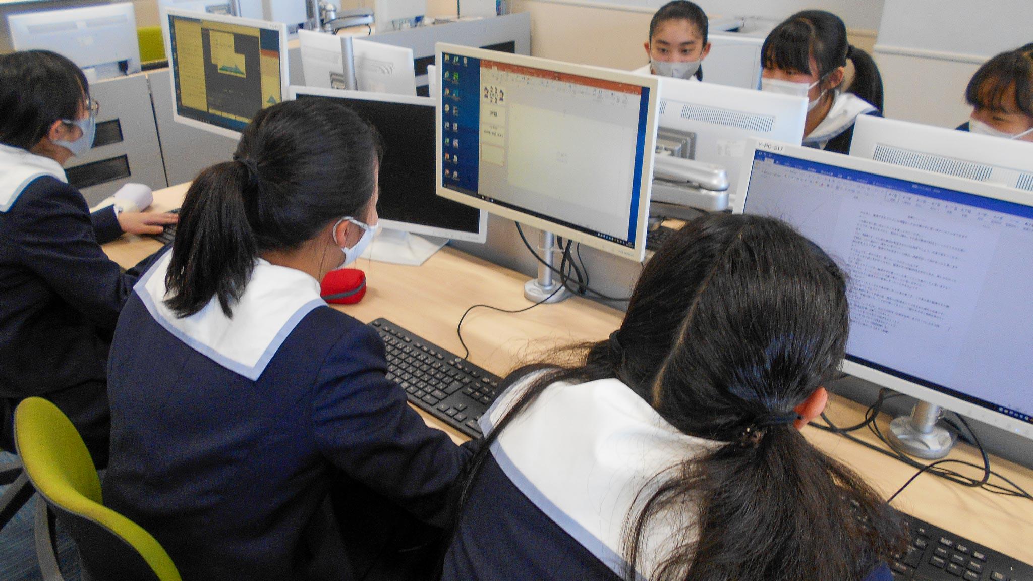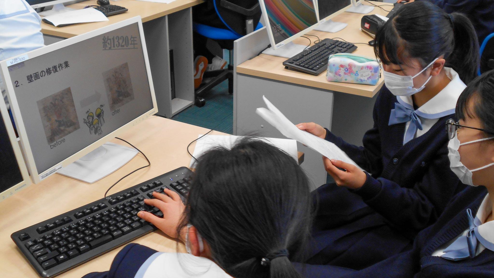 M3では飛鳥社会見学で体験した各遺跡・寺院等についての研究成果をまとめ、プレゼン用パワーポイントでスライドをつくって、来週行われるクラスでの予選会に備えています。上位に選ばれた班が、2月のM尚志祭の壇上発表に出場することになっています。パワーポイントの操作も手慣れたもので、動画やイラスト等を駆使して面白いスライドが次々とできあがっていました。