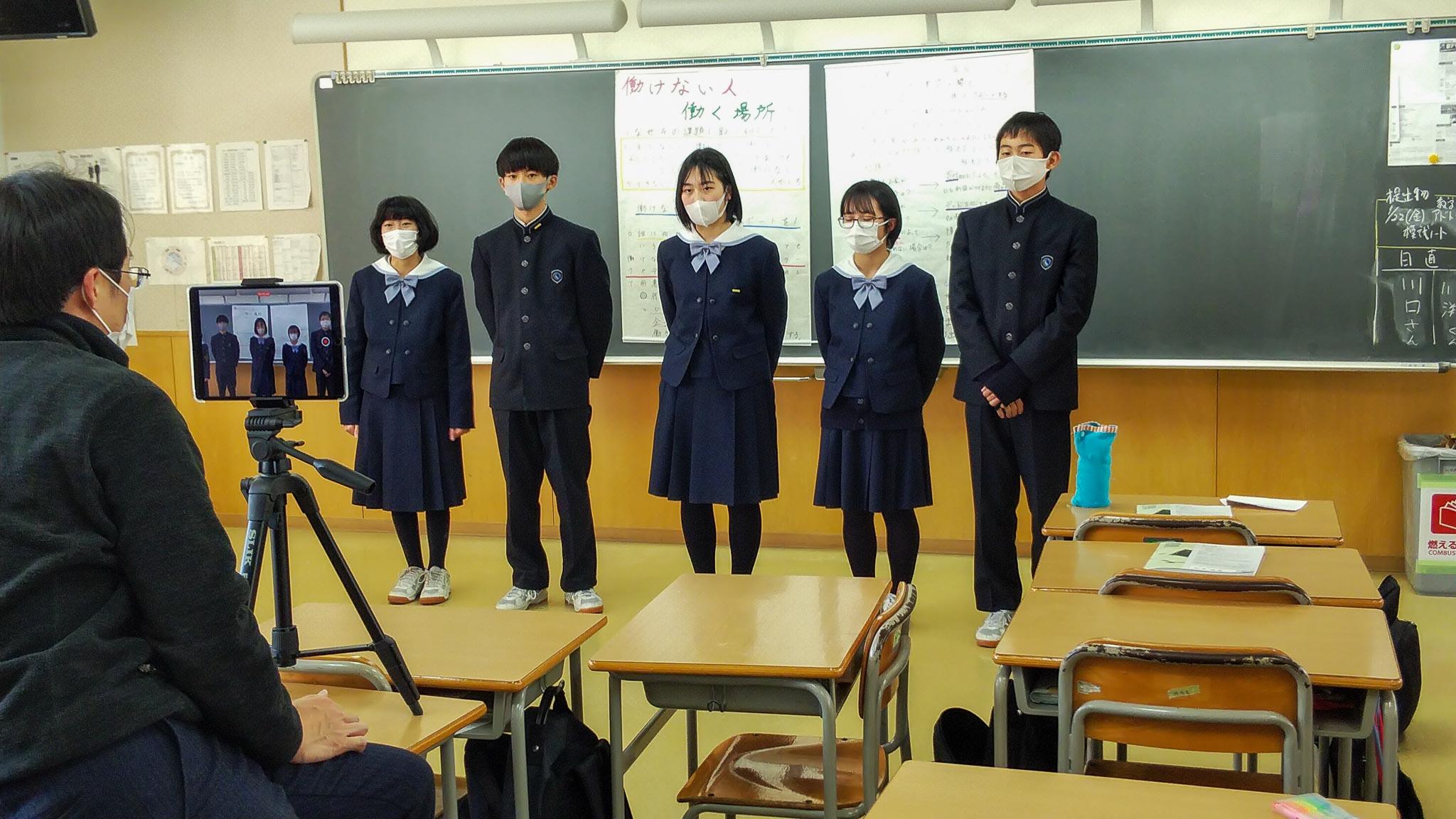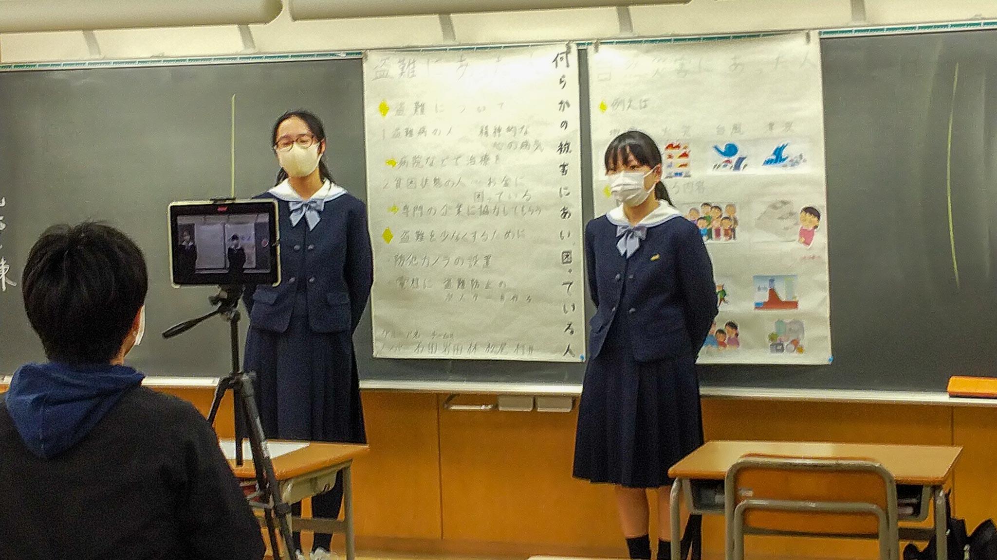 教室で受ける授業のほかに本校の特色である体験型学習の一環として実施したM3(中1)の飛鳥社会見学の事後学習の様子、またM4(中2)で今年度より初めて導入した探究学習のプレゼン動画の撮影を見させてもらいました。コロナ感染拡大の影響を受けて、計画を変更しながらではありますが、生徒の主体的な活動を生かしたこのような学びの機会をストップさせてはいけないと考えています。