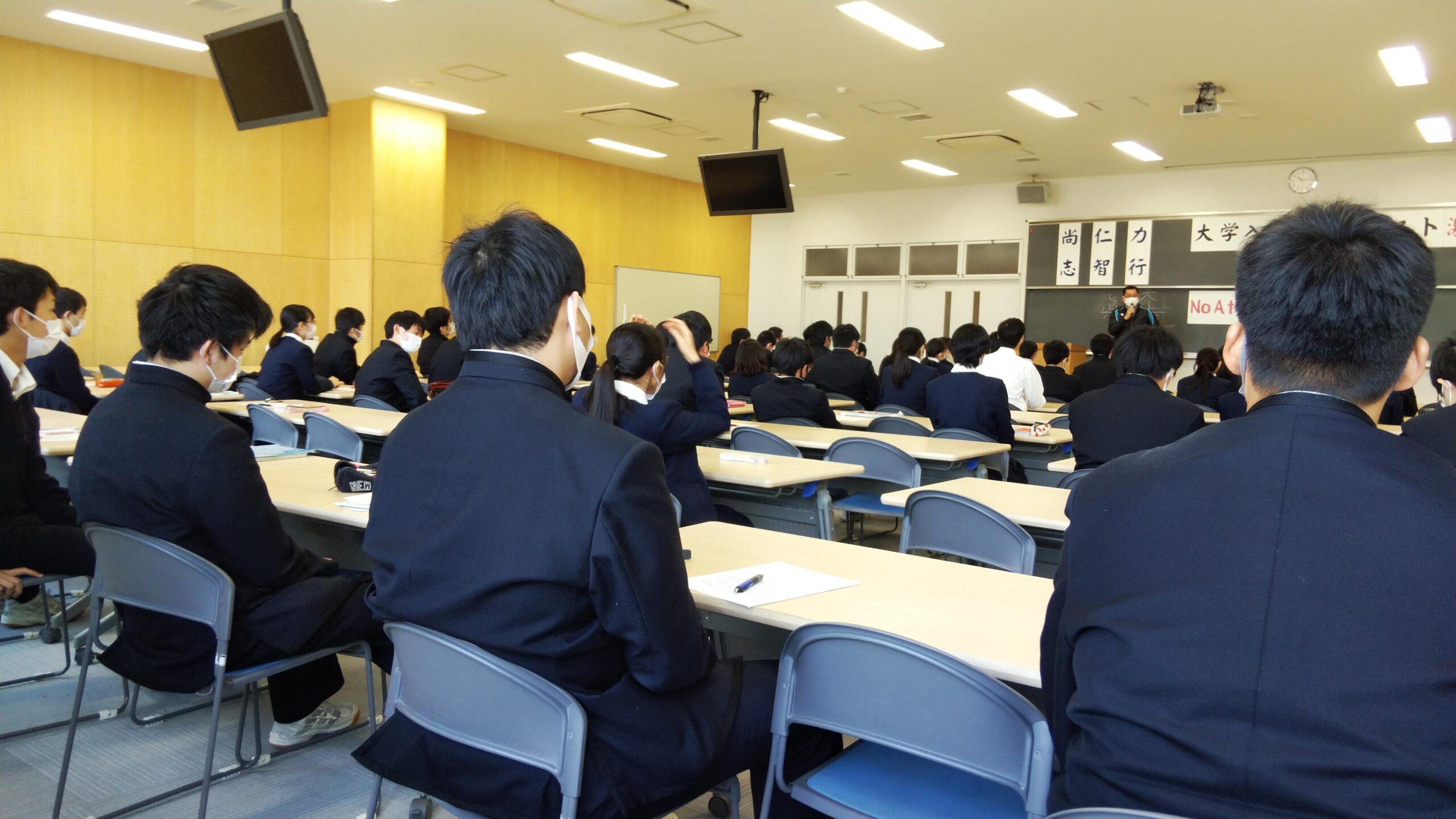 進路部長より受験上の諸注意、感染予防対策、受験会場での過ごし方などの細部にわたる話があり、続いて校長も担任として受験指導をしていた頃を思い出し、難問に行き詰まったときに唱えると御利益のある”呪文”を伝授しました。
