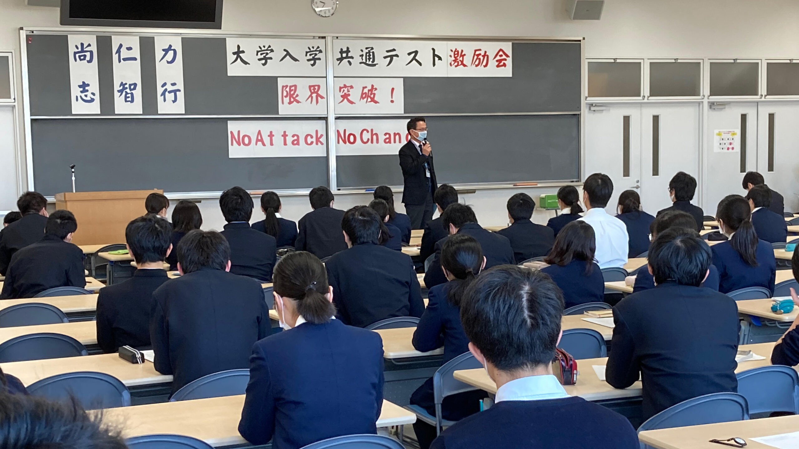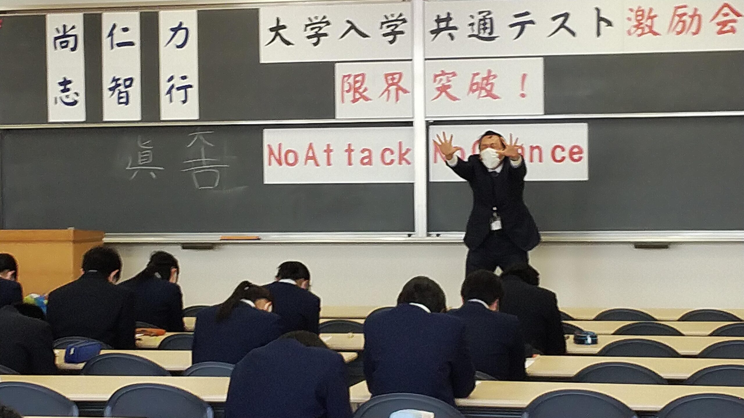 各先生方からは、ユーモアも交えて自身の体験談や過去の受験生のエピソード、共通テストに向けての最後のアドバイス、平常心の保ち方、緊張をほぐす”ツボ”の解説など心温まるお話のほか、今年もまた生徒全員に「気」を送ってくれた先生、「学年目標の『限界突破』は可能。なぜなら限界を決めるのは自分だから」「どんな点数を取っても何とかするのが我々の仕事」などの力強いメッセージもいただきました。いつも通り、君たちらしく、これまでやってきたことを信じて、100%の力を発揮してほしいと願っています。