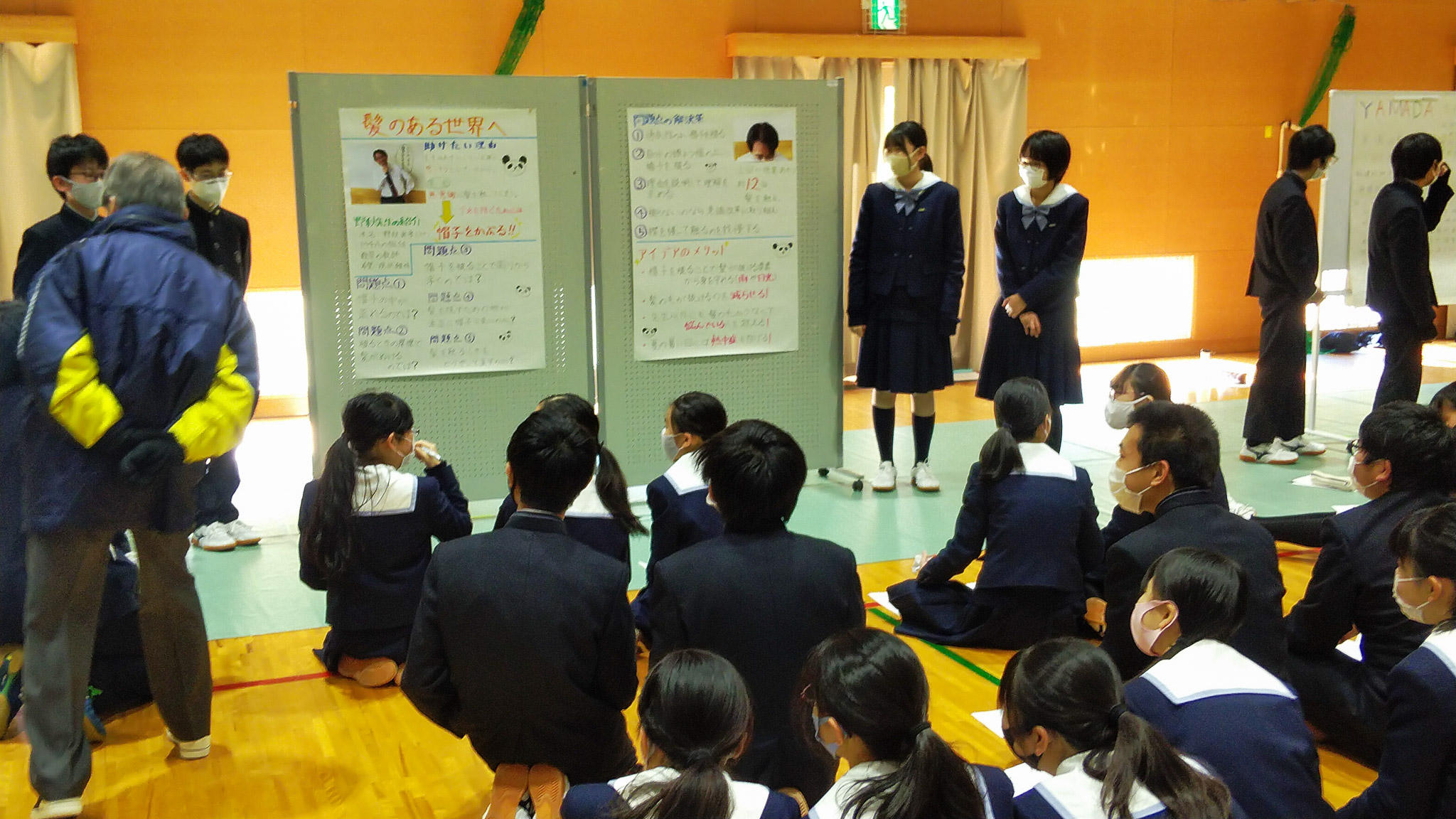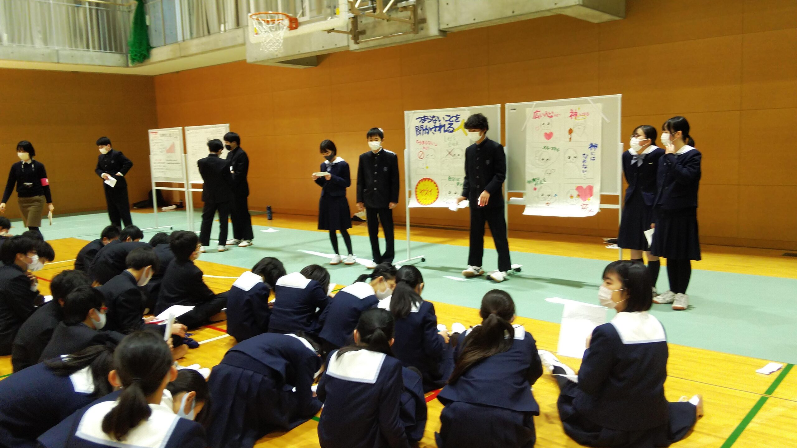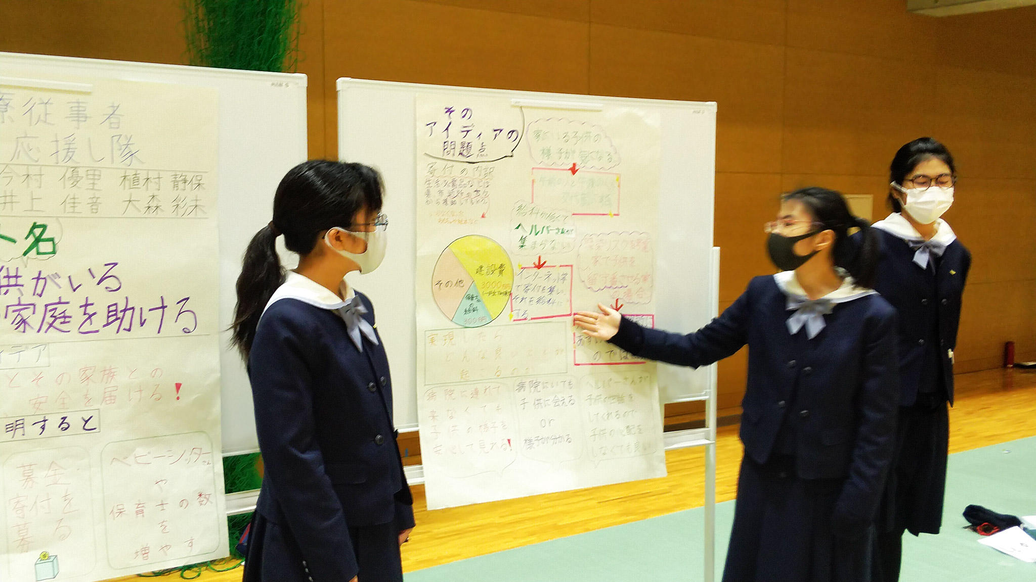「困っている人」として、「コロナで忙しい医療従事者」「戦争に巻き込まれている小さな子ども」「就職難の人」「アフリカの貧しい子どもたち」「全盲の人」「いじめている人」「ユニセフに助けを求める難民」「発展途上国への支援」「自分たちのお母さん」「〇〇先生」などなど実に多彩です。中学生の視点で課題を発見し、いろんな切り口から解決策を探り、出てきた問題点をまた克服する方策を練ってチームでディスカッションを繰り返し、「最適解」にたどり着きます。ポスターも工夫を凝らした力作揃いで、参加した後輩たちからも「皆さんしっかり考えていらっしゃってすごいと思った。」「面白かったです。」の声が聞かれました。