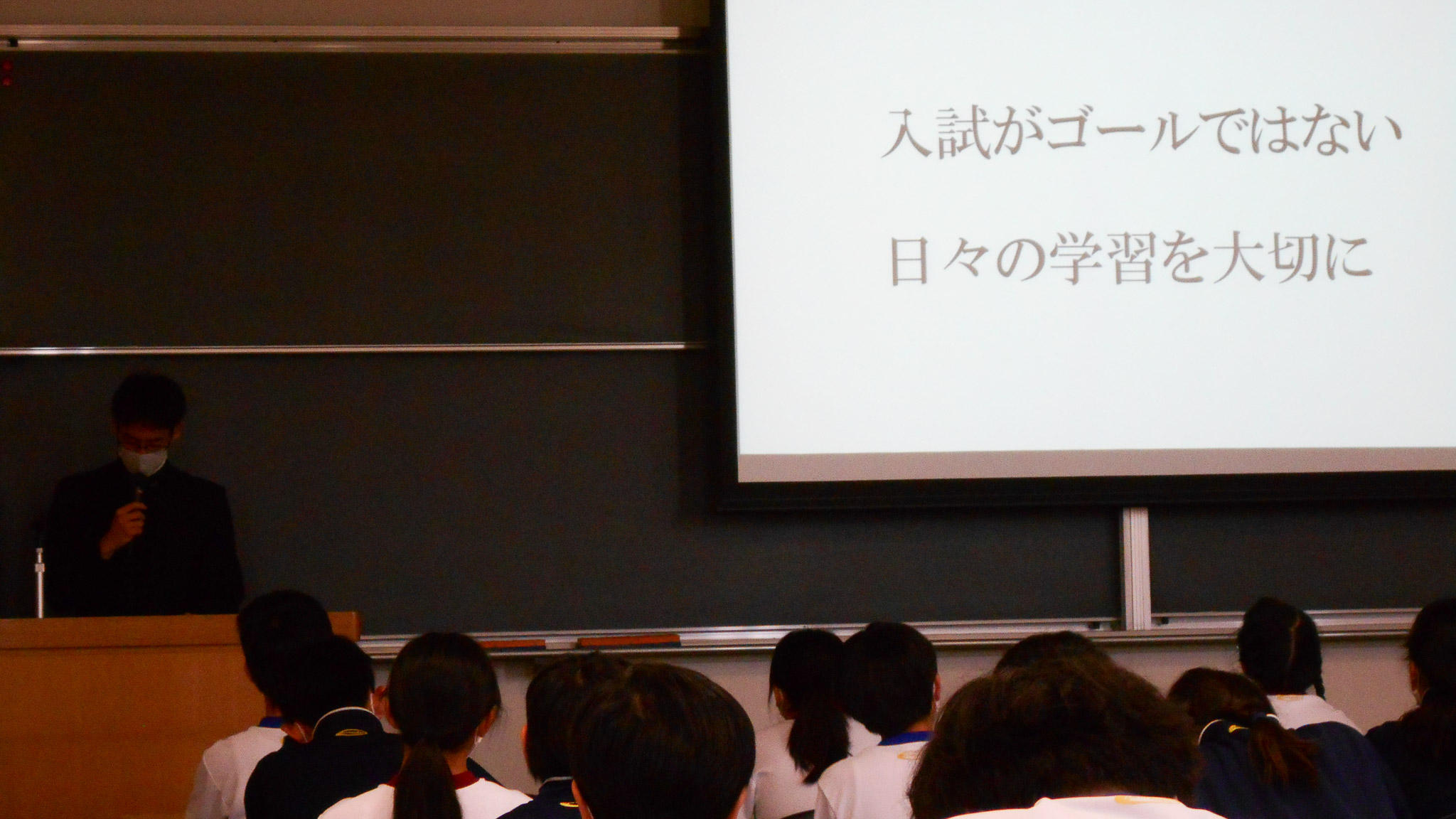 生活面では「小学校では先生に引っ張ってもらっているが、中学では自分たちが主体となって物事を進行していく機会が多くなる。」「自分たちのしたいことができてより楽しくなる。」と語り、勉強の仕方では「一回一回の授業を大切に。中学では進度も速く、内容も濃くなる。分らないところはすぐに先生に聞きに行き、その日のうちに解決するのがよい。」「悪い点を取ったときこそ、自分が伸びるチャンス。」とアドバイスしました。中学入試を間近にしている後輩には、「入試がゴールではない。日々の学習を大切にすること。プレテストが悪かった人もまだ本番ではないから大丈夫。結果より間違えたところに重点を置いて復習すること。」と的を射た忠告でありました。