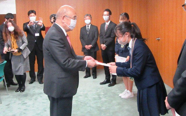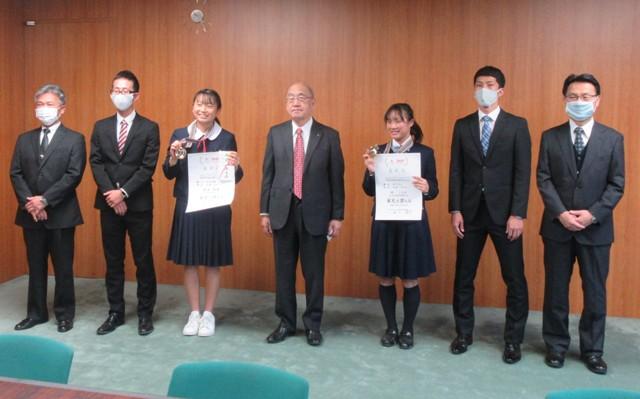 続く県教育長からも「高校でもさらにレベルアップを目指して、好きな陸上競技を楽しむ気持ちで頑張ってほしい。」との言葉があり、本校監督からは、大きな試合でも全く緊張しない性格やコロナ対策で休校中も練習メニューを送信し、彼女も練習動画を返信するなどのやりとりで指導助言をしたことを説明しました。