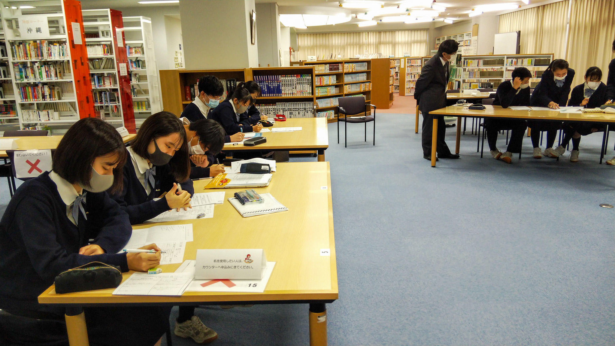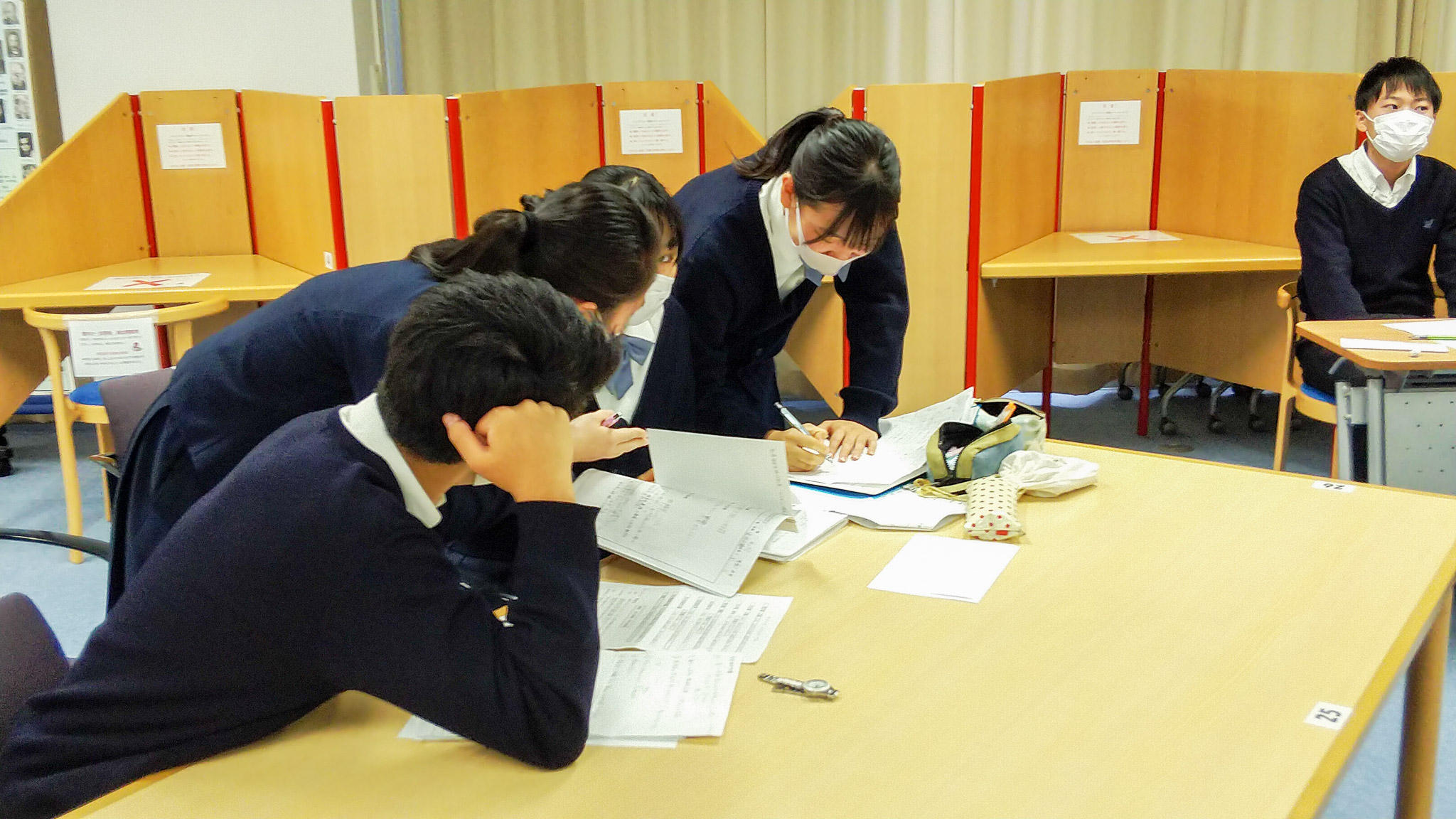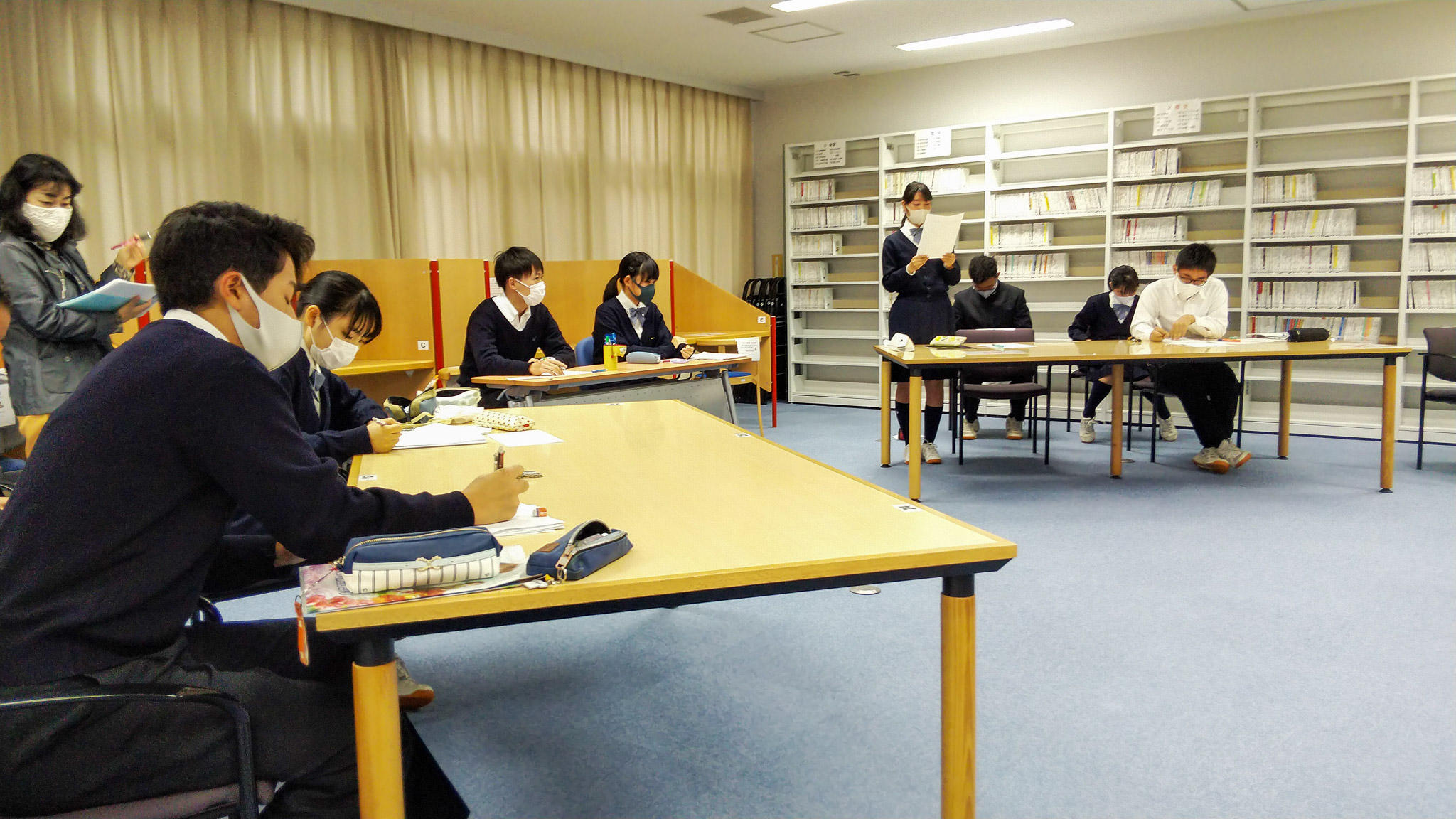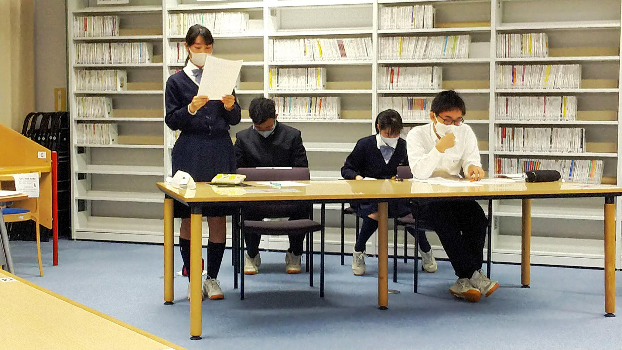 Y3学年(高2)「国語演習」の時間では、図書館でディベートが行われていました。テーマは「死刑制度の是非について」で、4名のチームが肯定側と否定側に分かれて討論し、審判グループの生徒の判定で勝敗を決します。