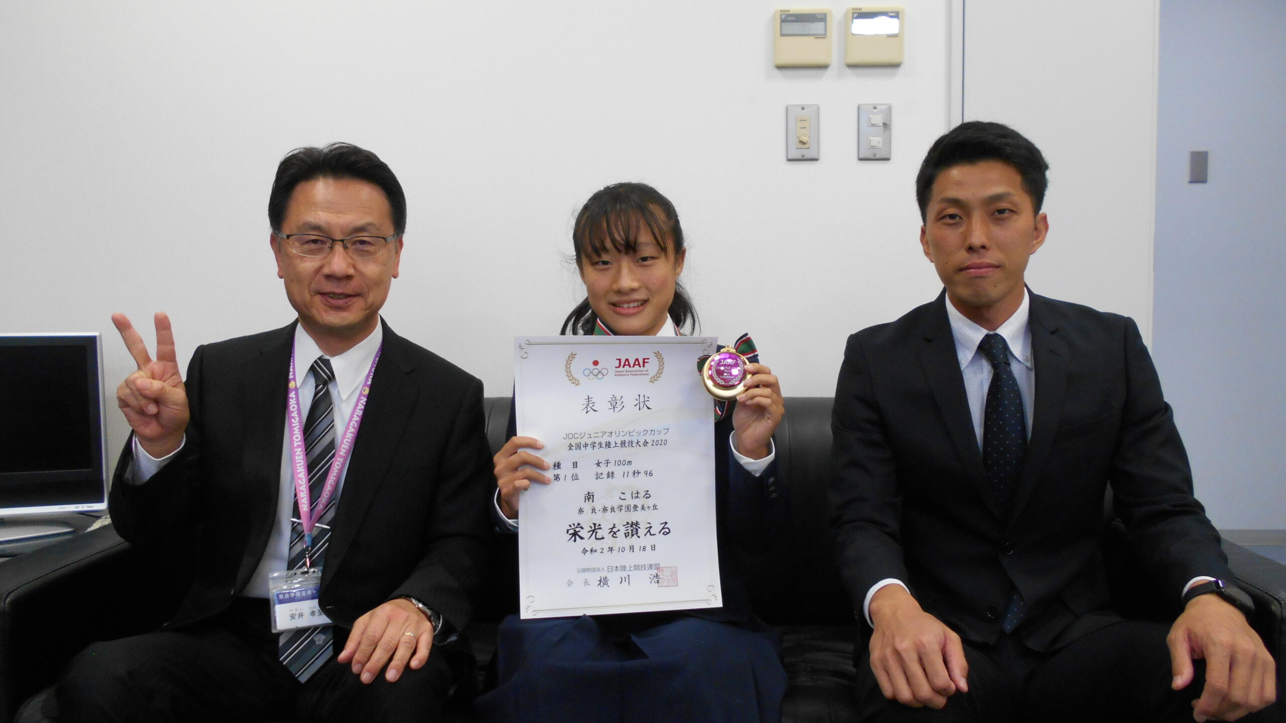 Y1生(中3)の南こはるさんが、横浜で開催された全国中学生陸上競技大会の100mで、見事全国優勝を果たしました。おめでとう。まさにWonderful、Excellent、Amazingであります。記録は、自己ベストを更新する11秒96で、自身が持つ奈良県中学記録を更新し、奈良学園登美ヶ丘の歴史に燦然と輝く1ページを刻んでくれました。