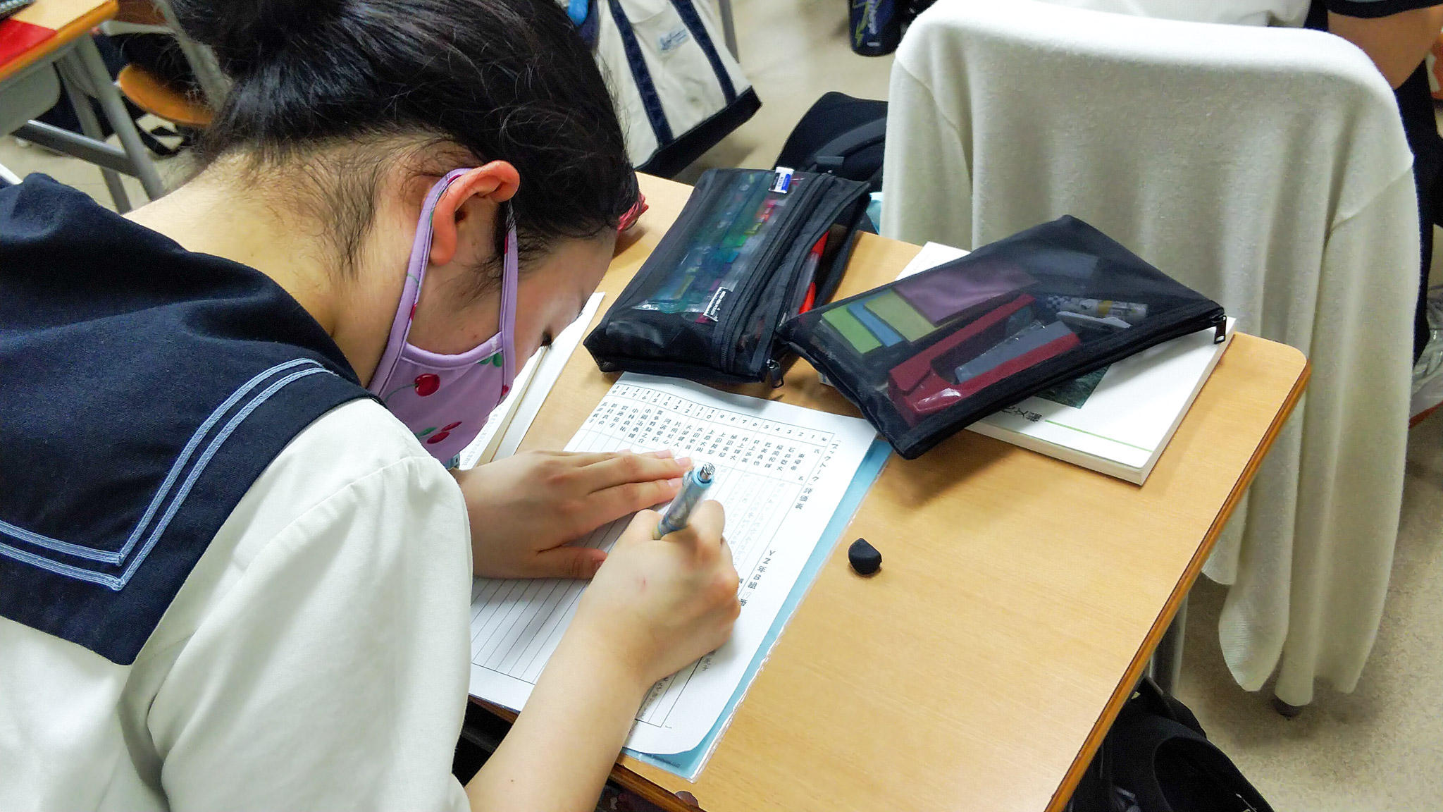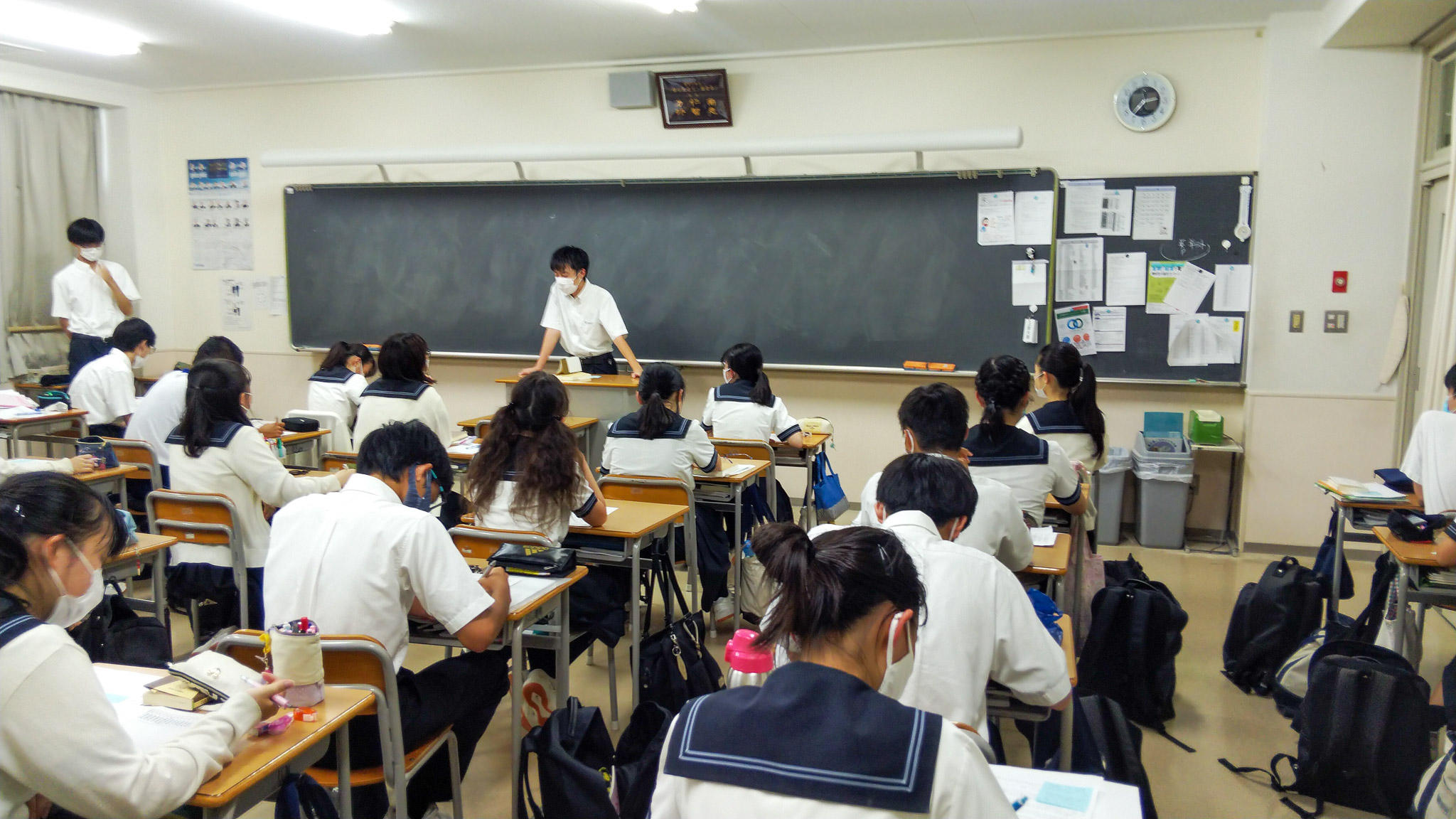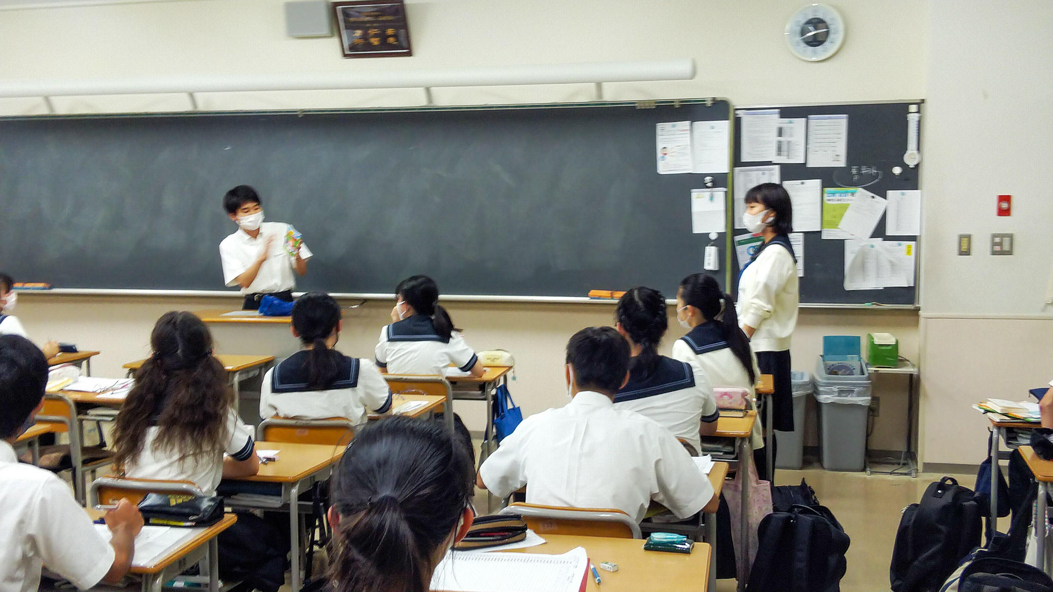 Y2学年の国語の時間、「ミニブックトーク」を見学させていただきました。学年全生徒が、自分のお気に入りの本を2分にまとめて紹介し、感想記録を書き込みます。