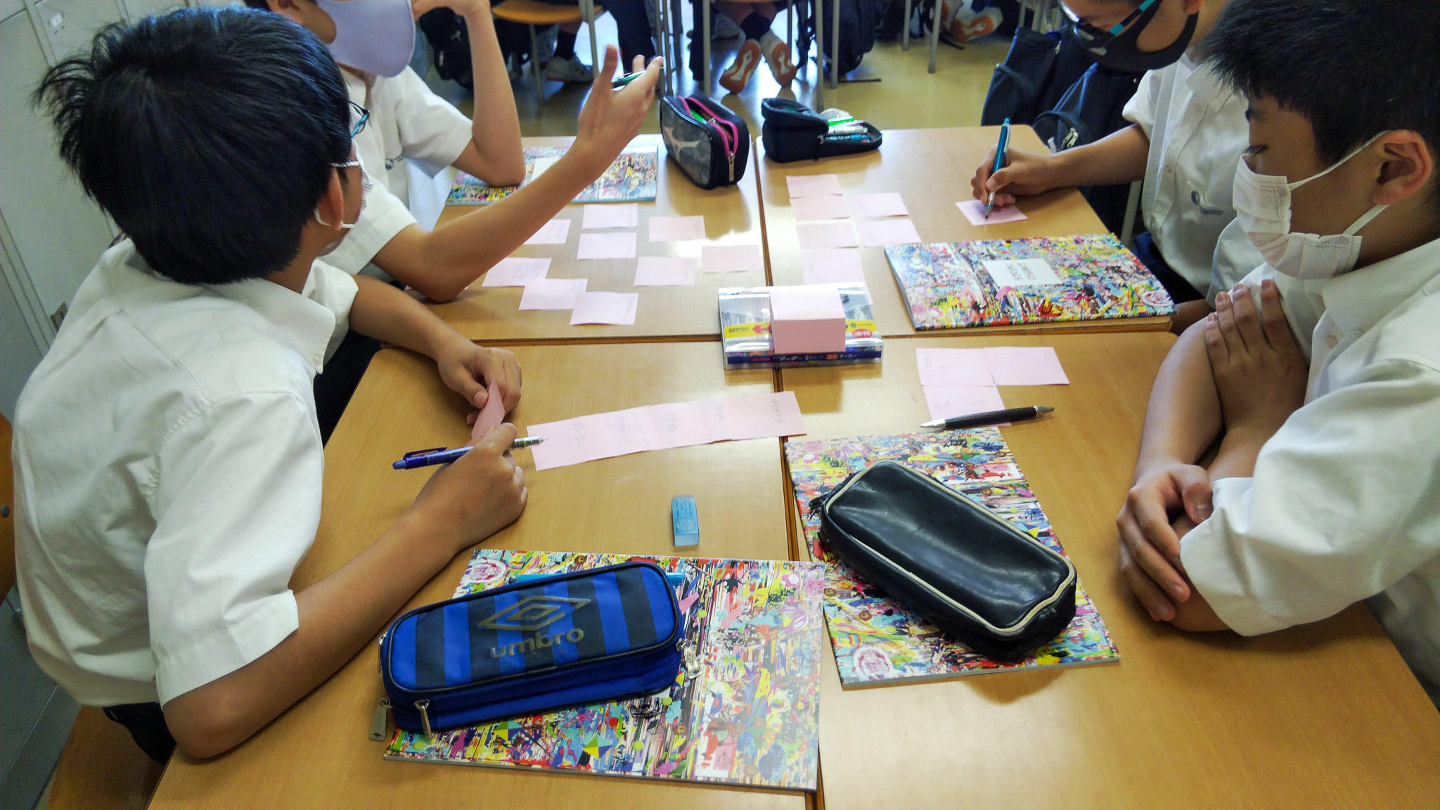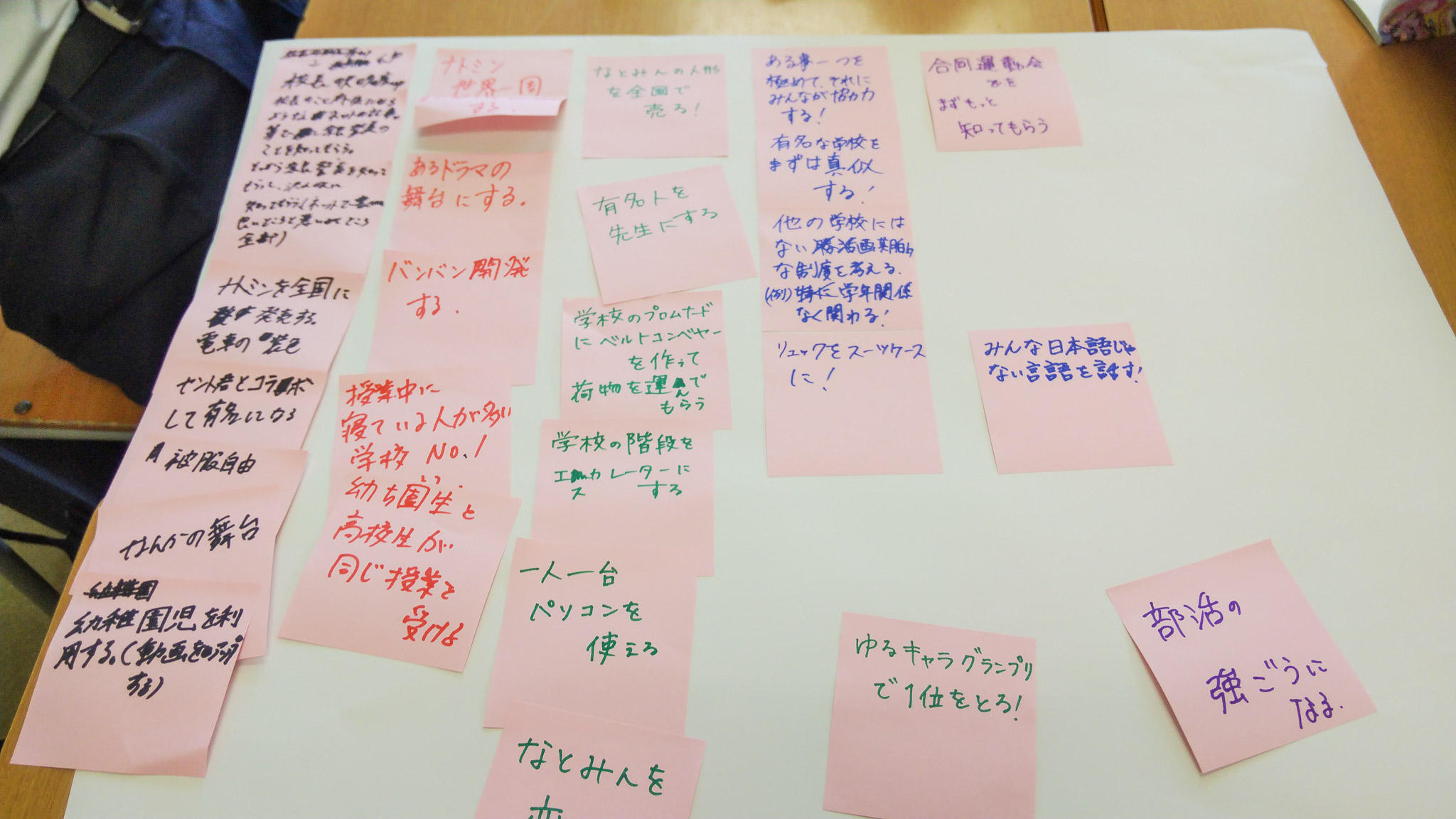 今日のM4では、まずこれから生徒たちが体験する様々な活動を動画で視聴し、先生から出された一つの課題について、思いつくこと、感じることをどんどん付箋に書いていきました。ルールは、1.他人の意見を否定しない、2.自分の意見を否定しない、3.なんでも言ってみる、の3つです。クラスごとに出されたテーマは、「学校を日本で一番有名にする方法」「本当にやりたい卒業式」「全校生徒で1億円稼ぐ方法」など。皆でワイワイ楽しみながら、友達の意見に驚きの声や「やってみたい」の声も聞かれました。「学校を日本で一番有名にする方法」では、「先生の授業のわかりやすさ」「学校全体で一つのことを研究する」「有名人を教師にする」のほか、「生徒の伸び率を日本一にする」と書いてくれる生徒もおり、校長への気遣いができる生徒たちに感心しました。次の時間からは、これらのアイデアをまとめ、企画にしてプレゼンへと展開していきます。