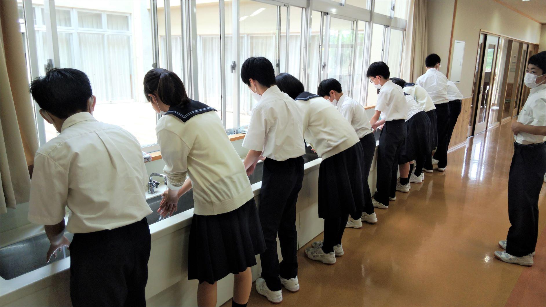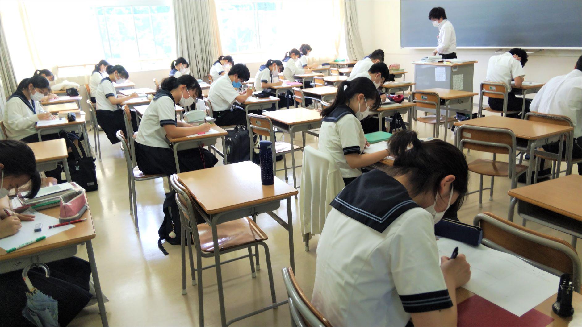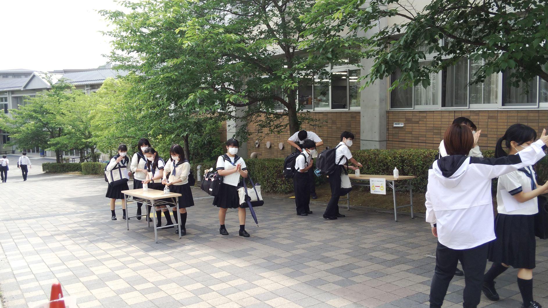 6月1日・2日、隔日分散登校の形で学校を再開させました。公共交通機関の混雑を避けるため、6月いっぱいは通常校時の2時間目より授業を開始します。生徒たちが書いたClassiのコメントを見ると、「学校へ行くのが楽しみ、早く友達と会いたい」という記載が多く見られました。まだまだものものしい健康チェック態勢、感染防止指導が続きますが、段階を踏んで日常を取り戻していきます。昇降口前で登校の様子を見ていると、まだ検温忘れや、チェックカードの記載漏れや保護者印漏れが見られます。自分の命と自分の大切な家族や友達の命を守ることにつながるルールです。ご協力をよろしくお願いします。
