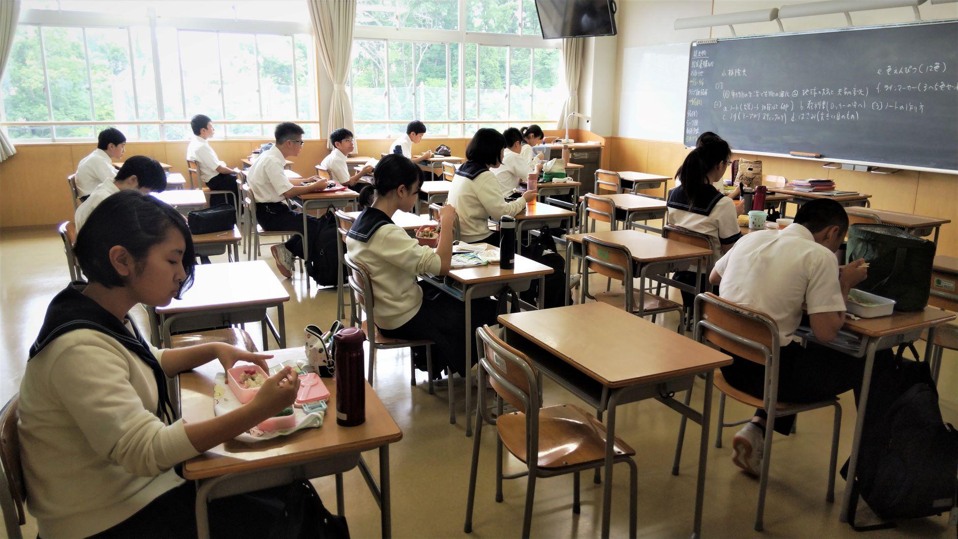 子どもたちは手洗い、手指消毒を済まして、それぞれの教室で黙々といただいていました。まるで”禅寺”の如く、一口ずつ噛みしめて味わっているようでした。