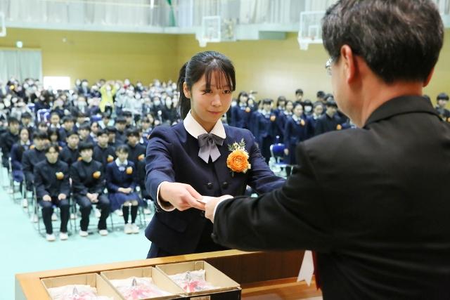 卒業記念品として、建学の精神・校訓の銘板を寄贈いただき、誠にありがとうございます。体育館上手に掲げさせていただき、日々仰ぎ見ることで後輩たちが進むべき道のしるべとしたいと思います。