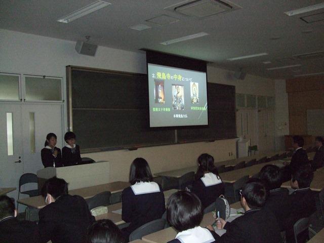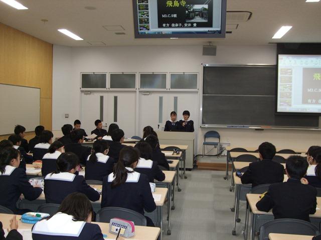 本番はさすがにクラス代表に相応しい発表内容で、各史跡について調べたことを分かりやすくイラストや年表、また動画なども駆使して資料づくりに工夫が凝らされていました。中には、飛鳥に伝わる伝説をシナリオにして、演劇仕立ての名演技でプレゼンした班もあり、飛鳥についての興味が益々深まりました。