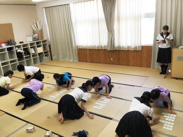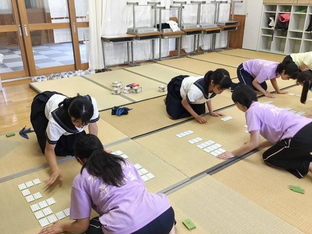 Y1生の二人は現在C級(初段)で、今年1月の高松宮記念杯近江神宮全国大会で、それぞれ部門優勝と3位入賞を果たしての昇段です。二人とも奈良県個人戦の選考会で勝ち抜き、全国大会出場となりました。話を聞くと「負けず嫌いな性格で、小4の頃、いとこが強く、いとこに勝ちたい思いで百首覚え、小学校のかるた大会で優勝したことが競技かるたにのめり込むきっかけ」とのこと。またもう一人は「『ちはやふる』の漫画を読んで興味を持って以来、母にかるた会に連れられ、競技かるたを始めた。年下の子に負けてやめようかと思ったが、本校中学から技術を学んでここまで来られた。」と語ってくれました。