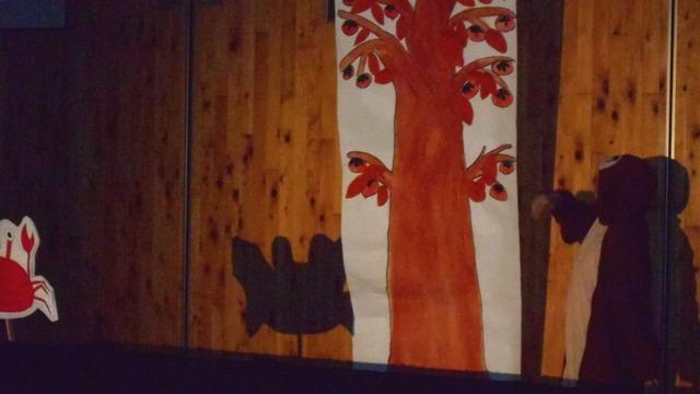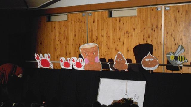 今年の出し物は「さるかに合戦」。主役の猿役は着ぐるみを付けての迫真の演技。カニ、ハチ、ウスたちはY学年の先輩が人形を動かし、声はM3・4生が声優となって演じました。舞台装置も楽しくデザインされ、ハラハラどきどきの展開に釘付けとなった園児たちから大きな歓声が上がっていました。