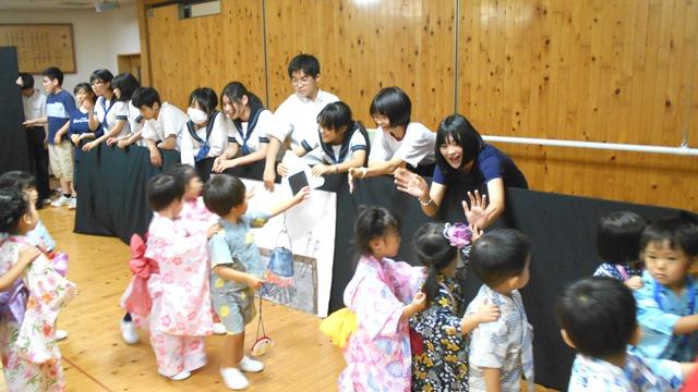 7月20日、本学園の幼稚園で「夕涼み会」が開催されました。様々に工夫を凝らした模擬店やゲーム、盆踊りなどの企画があり、その中でMY生演劇部員によるパフォーマンスが毎年、園児たちの人気を集めています。