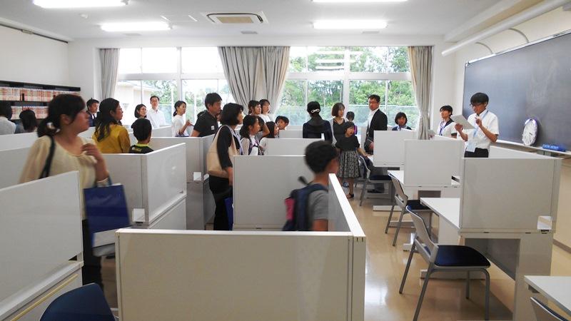 校長挨拶、担当教員からの学校概要説明に続いて、生徒会代表2名による学校紹介のプレゼンがありました。本校の特色ある宿泊研修や国際交流事業、部活動などについて実に丁寧に情熱を込めて説明してくれました。説明会後は、案内役を買って出てくれた「チームなとみん」の面々が5グループに分かれて特別教室・実験室・図書室・ダイニングなどを解説しながら案内。質問にも的確に応じ、お褒めの言葉をいただきました。参加した子どもたちもきっとこんな生徒になりたいと憧れの気持ちを持ってくれたことと思います。