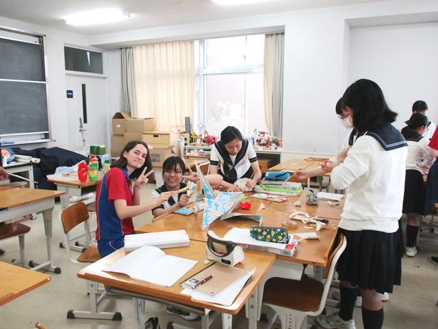 美術では、大きな模造紙を使って鶴の折り紙を製作していた。どの班もなかなかの大作であり、苦労のあとがうかがえる。そして、折った後は皆で色を塗り始めた。丹頂鶴の白・黒・赤というイメージからは程遠く、どの班のものもカラフルである。ワイワイと楽しそうに色を塗っている姿に、いつも彼らがそこにいるような日常の光景を感じることができた。これが若者たちの交流の速さなのだろうと思った。