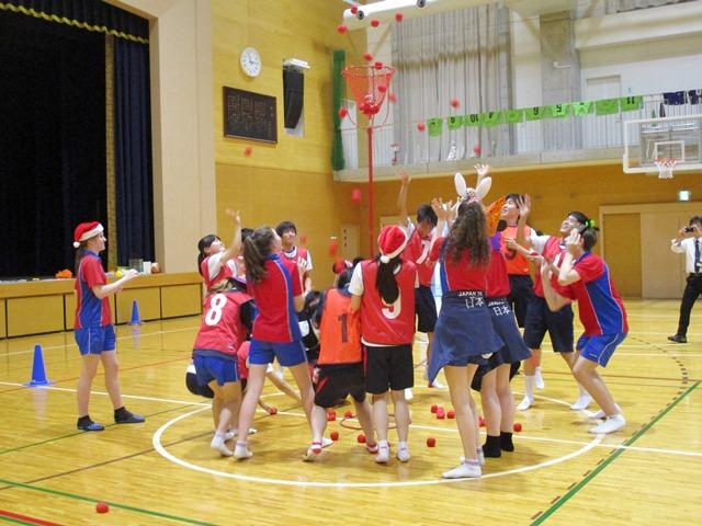 この日は、M4やM3学年の生徒たちとの交流授業も行われた。そして、最後の6限目の授業では再びY3生とのLHR交流があった。MY体育館でのミニ運動会である。ラジオ体操もきちんと行い、競技が開始された。皆が最も楽しんでいたのは「ダンシング玉入れ」。音楽が鳴っている時には踊り、それが止まっている時には玉を投げ入れる。ダンス好きの両国の生徒たちにとってはどちらも面白く、キャーキャーと歓声を上げて取り組んでいた。ここでも若者たちのエネルギーと親密になる早さを大いに感じさせられた。見ているこちらも大笑いし、楽しませてもらった。