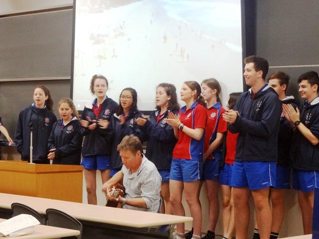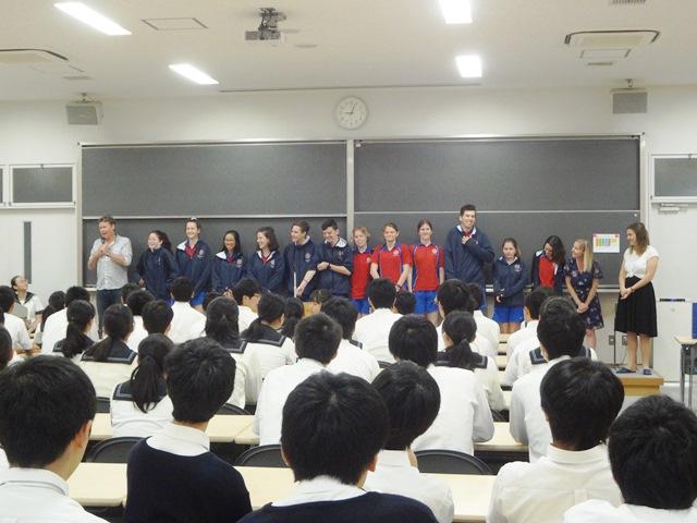 この日の最初の交流は、今年度オーストラリア語学研修に行ったY3(高2)学年の生徒たちがホスト役になってのウェルカムセレモニー。語学研修中にアクアイナス校に通っていた生徒たちにとっては約4ヶ月ぶりの再会であり、顔見知りのアクアイナス生に出会って旧交を温める姿も見られた。セレモニーでは、最初に私とカレン先生による挨拶とプレゼント交換があり、続いて本校生代表による歓迎の挨拶、アクアイナス校の生徒及び先生方の自己紹介が行われた。アクアイナス校のプレゼンテーションでは、ドラマの授業を担当するアーサー先生のギター伴奏での歌や、慣れない日本語を駆使しながらのアクアイナス校紹介動画の披露があり、大講義室が一気にオーストラリアムードになっていった。しかし、Y3生たちを見ていると、それらが当たり前あるかのような自然な様子である。やはり、わずか2週間ではあるが、その時の経験が彼らに自信と余裕をもたらしているのであろうと感じることができた。