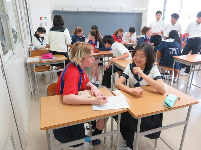 セレモニー終了後は、校内見学とガイダンスを行った。オーストラリアでは広い敷地の中に2階建ての教室棟が点在し、外に出て移動することが多いが、本校は4階建てで、それぞれの棟が繋がっている構造である。慣れないとどこを通っているか分からなくなることもある。アクアイナス校の生徒たちも少し戸惑いながらの校内見学であった。Y棟屋上から学校周辺の景色を眺めるという体験も用意し、日本の学校の設備や環境を知ってもらった。また、Y1生との授業交流や、バディーと一緒にランチを食べたりと、学校内での生徒の生活の様子も体験してもらった。この交流は、9月29日(土)まで続けられる予定である。