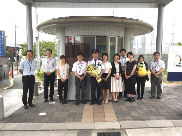 大西警備員は、その礼儀正しさやきれいな敬礼で本校の児童や生徒にも有名だが、当日も訪問した私たちを丁寧に迎えてくださった。教職員による色紙を私から、花束を梅田校長からお渡しし、退職のお祝いとお礼の言葉をお伝えして、皆で記念写真を撮らせてもらった。