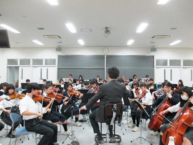 両校の室内楽部員、OB・OG諸君、賛助出演してくださる方が集まり、本校の上田先生の指揮で練習が始まった。本番も近づいてきており、この日は全曲を通しながらの練習である。練習の機会が多かった生徒たちはかなりこの曲に慣れてきたようで、難なく弾き(吹き)こなしている。テンポにも十分対応できている。この曲をここまでできるとは大したものである。ところが、合奏練習2回目の私は、小節を数え忘れたり、早いテンポについていけなかったりと練習不足が露呈してしまう有様。とは言え、この「新世界」を演奏しているということ自体に何とも言えない喜びを感じることができた。第2楽章の有名な旋律を奏でるイングリッシュホルン奏者がこの日は欠席。残念ながら、郷愁に満ちた旋律を味わうことはできなかったが、本番までにもっと練習して、曲の中に自分を溶け込ませるようにしておかなければと思った。
