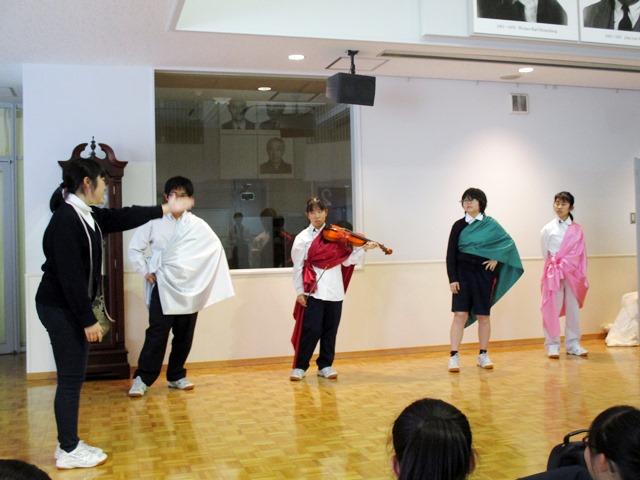 2本目は、奈良学園登美ヶ丘版『走れ迷路須』。オリジナル作品である。太宰治の『走れメロス』をどのように翻案しているのかがとても楽しみであった。また、「邪知暴虐の生徒会長」役の大友君の練習での演技が迫力のあるものだったので、大いに期待していた。生徒会規約違反を犯した「迷路須(通称メロン)」は、仲良しの友人「芹沼(通称セロリ)」を守るため、400字の反省文を所定の時間までに生徒会長に提出しなければならないというストーリーなのだが、この「迷路須」が時間にルーズで方向音痴という設定が面白かった。演技者も観客も皆この場にいるのに、校内外のあちこちを駆け回る「迷路須」と一緒に走り回っているという気持ちにさせられるのである。なかなかよくできた作品だと思った。観客のM3生や本物の生徒会長や生徒会役員たちも大いに楽しんでいた。最後に友情や信頼の価値に気づく「邪知暴虐の生徒会長」も、密かに次期生徒会長を狙っていた「慇懃で狡賢い副会長」も、いつもながらの好演であった。