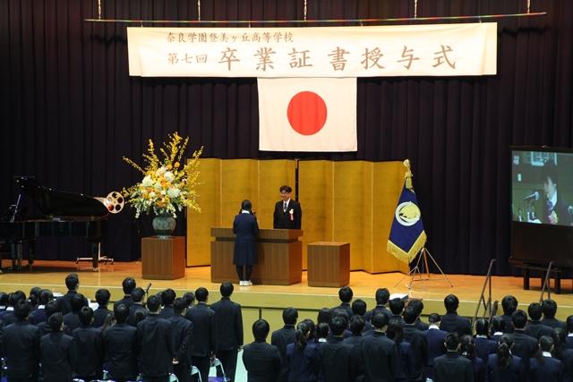 3月3日(土)、第7回高等学校卒業証書授与式を開催した。高校7期生であり、中学校5期生の112名の卒業式である。式辞では、本校の保護者からいただいた手紙や文科省が提唱する「主体的・対話的で深い学び」を紹介しながら、「主体性」についての話をさせてもらった。最後は、「本校の建学の精神である『自ら生きて活きる』に込められた、『自ら生きる』という逞しい力と、『自らを活かす』という時代を読む賢さを身につけ、皆さん一人ひとりが主体的に生きていってほしいと願っています」と結んだ。