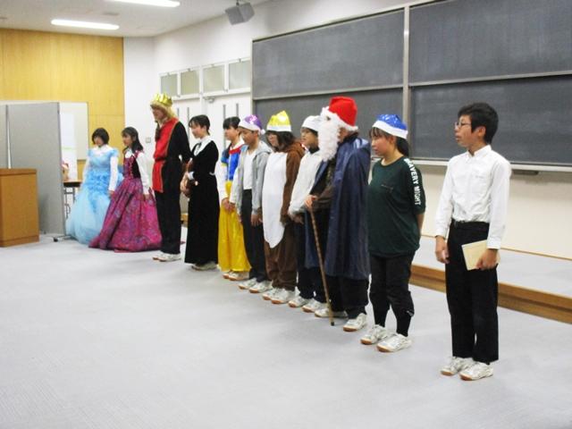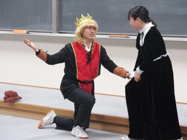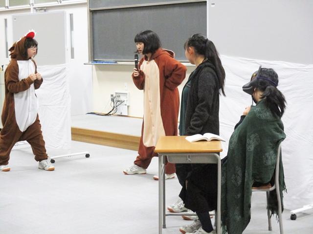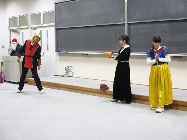 最初の劇は、「白雪ンデレラ」。既存の脚本に部員たちがさらに脚色を加えながら出来上がったもののようだ。「白雪姫」と「シンデレラ」を組み合わせたのだろうということは分かるが、「さて、この2つの違いはどうだったっけ?」と私の中で早速疑問が生じ、毒リンゴとガラスの靴がごっちゃになってきた。これもこの脚本の狙いかもしれない。継母や姉たちが登場し、そこに魔法使いや小人たちも絡んでくる。衣装こそ「白雪姫」なのだが、主役の「白雪ンデレラ」もボケたり、ツッコんだりと、想像通りのドタバタ劇である。さらに、これも想像どおりなのであるが、ハチャメチャな王子の登場である。もはやストーリーよりも、若手漫才のような会話のテンポが勝負といった展開である。