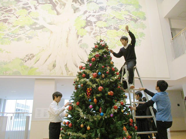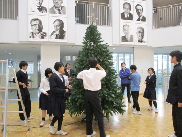 12月8日(金)、サイエンスホールに、恒例のクリスマスツリーが設置された。この日は期末考査最終日。その結果に思い思いの気持ちを持つ者たちだが、まずは考査を終えての一区切り。生徒会役員たちがホールに集まって、ツリーを組み立て始めた。