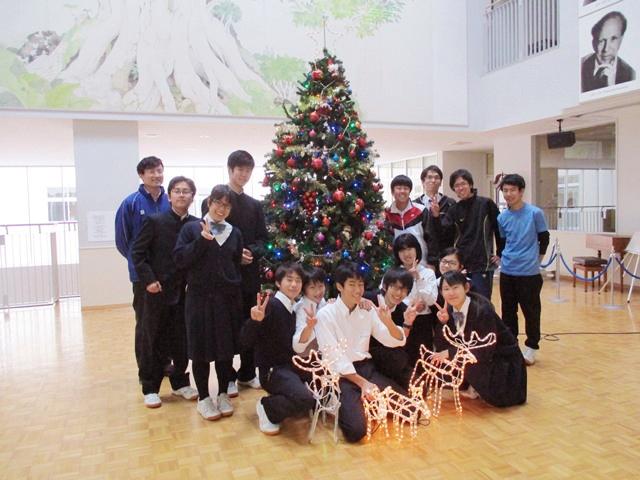 ほぼ完成という時になって、生徒会長が「左右のバランスが悪いんじゃないか」と言い出したために、またひとしきりああでもない、こうでもないと議論と試行錯誤が始まる。やれやれとは思いながらも、彼らにはこれが楽しいんだろうなと考え直してみた。出来上がったツリーの前に、電飾のトナカイを配置してようやく完成である。考査の後のホッとした気分とツリーを完成させたことの満足感を味わいながら、皆で記念撮影を行った。本校のすべての園児児童生徒が聖らかな気持ちでいられますようにと祈りながら、シャッターを切らせてもらった。