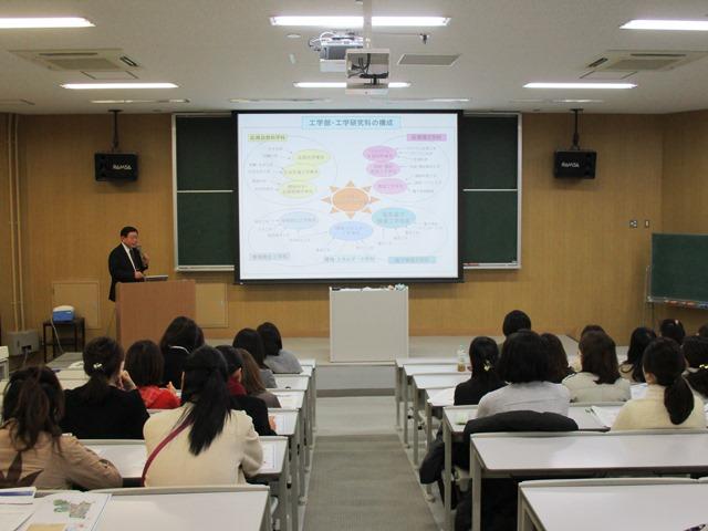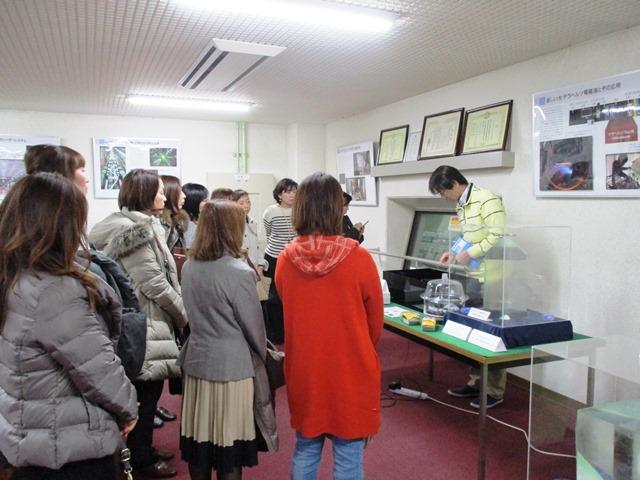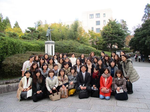 やや肌寒い気温ではあったが、良い天気に恵まれ、一行はまず吹田キャンパスに到着。伊瀬教授の案内でまず訪れたのは、同学の「レーザー科学研究所」。日本の大学の中でもトップクラスの設備だということで、この研究に携わっておられる理学研究科宇宙地球科学専攻の中井光男教授から詳しいお話と所内の案内をいただいた。中井教授の「ハイパワーレーザーが拓く新しい世界」というお話は、先生方にとっては初歩的な説明なのだろうが、まったくの素人の私にとってはたいへん専門的で、話に頷きはするものの、先生が思われるほど理解できていないことを申し訳なく思った。でも、学生たちがこのような環境や設備の中で、こんなに情熱的な先生から指導を受けられるということに、お母さん方は興味を惹かれたようである。