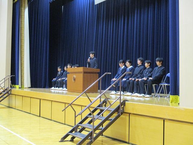 任命式後、新生徒会長となった森田君から生徒全員に向けて挨拶と所信表明があった。スローガンは、「生徒会がもっと前に出て、生徒がもっと楽しめる学校に!」。歴代の生徒会執行部が行ってきた、挨拶運動・機関誌の発行・目安箱の活用・ベルマークの回収などの取り組みに加えて、昼休みの生徒会による放送・他校の生徒会との交流・開校10周年を記念する行事への関わりなどの新たな取り組みへの方針が述べられた。