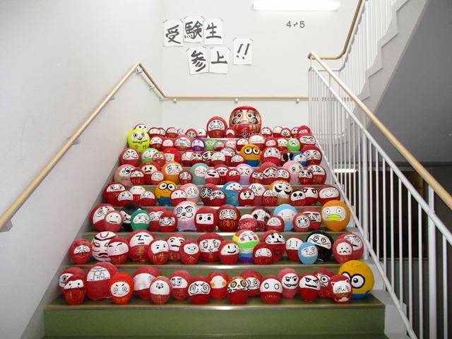 Y棟の階段を上ると、最上階のY4フロアへ行く手前の階段にたくさんのダルマが並べられていた。実はこれ、尚志祭に参加できないY4生たちが、自分たちの身代わりを参加させたいと考えて作られたものである。流行りのミニオンを模したものなどもあり、皆華やかで良い顔をしている。Y4生一人ひとりにいろいろな思いはあるのだろうが、ダルマのようにどっしりと構えて受験勉強に取り組んでほしい。