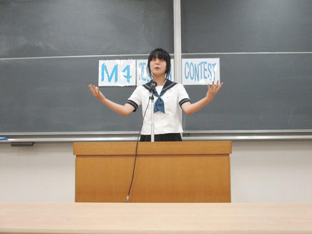 1~2限目にM3のコンテストが行われた。暗誦課題は例年と同じく「The Greedy Dog」。食い意地のはった犬が、川面に映った自分の影がくわえる肉を奪い取ろうとして、自らの肉を取り落してしまう話である。今年のM3生は例年以上に気合が入っており、開会直前まで発表の練習に取り組む者が多かった。会が始まって、いつもながら感心したのは皆が英文をしっかりと覚えていることである。中には、緊張のせいで詰まってしまった者もいたが、内容を理解した上での暗記がきちんとできていた。審査をしていて点数が分かれたのは発音と抑揚である。英語をよく知らない私が言うのもおこがましいが、聴いていて耳に心地よく、退屈しない話しぶりの者が高い評価を得たと感じる。