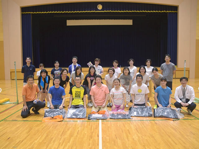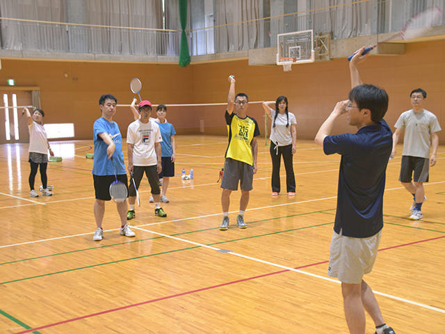 試合前には、恒例となったバドミントン部顧問によるレクチャーと実技指導が行われた。ラケットの持ち方や振り方、シャトルをとらえる位置や足の運び方などの説明があり、参加者は自分のレベルに応じて技術の再確認をしておられた。