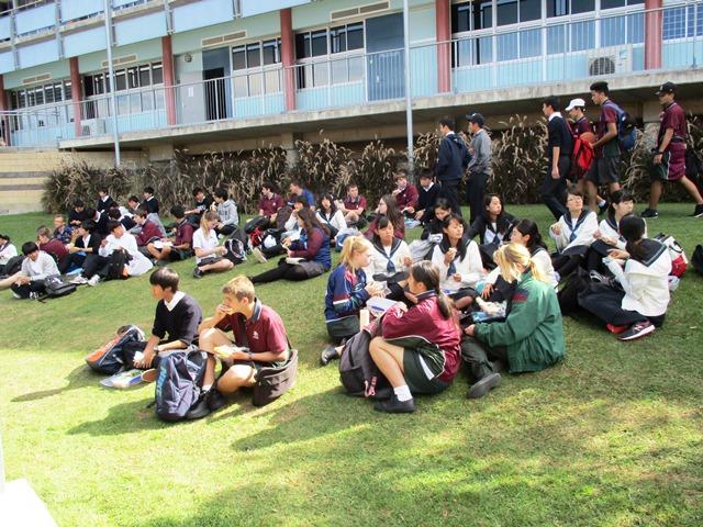 午前中に伺ったのは、今年新たに交流校に加わったパシフィックパイン校である。生徒たちはすでにこの学校で最初の一週間を過ごしており、学校にも慣れ、各自に付いてくれるバディともかなり仲良くなっているようである。私が着いた時にはESLの授業中。各自がホームステイでお世話になっているホストファミリーへの感謝の手紙を書いていた。英語にも慣れてスラスラ書いている者もいれば、電子辞書を引きながら単語を探している者もいる。ホームステイの最初の頃は上手くコミュニケーションがとれずに悩んだ者もいるようだが、一週間が経ってそうした不安や悩みを訴える者もなくなったと聞いている。彼らの柔軟性や寛容さにいつも感心させられる。