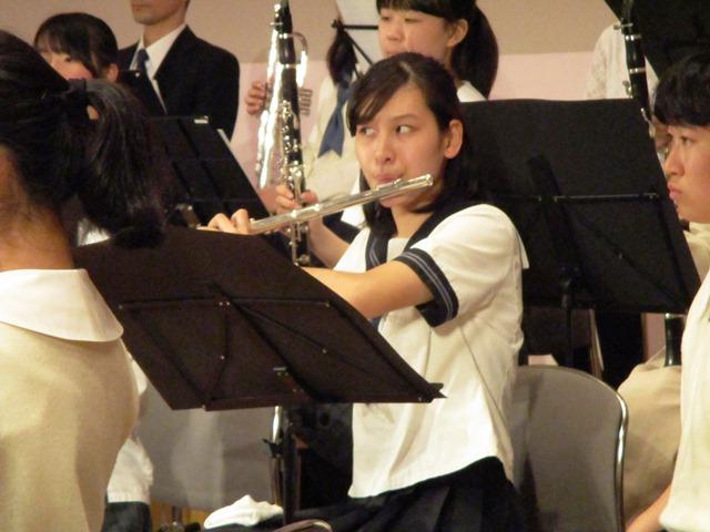 休憩後は、OB諸君や指導をしてくださっている先生方、賛助の方を含めての合同プログラムである。今年は、ビゼーの『アルルの女』第2組曲から「パストラール」「メヌエット」「ファランドール」の3曲を演奏した。いよいよフランス音楽に挑戦である。各楽器の音色や響き、そして華やかさが問われる。前日の練習から気になっていたのは、”「アルルの女」と言えばこれ!”と言われるフルート奏者たちの出来である。普通に吹けば難なくこなせるメロディーなのだが、舞台の上で、オケをバックにとなると、その緊張は並みではないはずである。伴奏する私たちの方も緊張するほどだ。両校の現役奏者が入れ替わりでソロを務めたが、なかなかの出来であったと思う。彼女たちの度胸に感心させられた。また、彼女たちにとってはとても貴重な経験になったことだと思う。